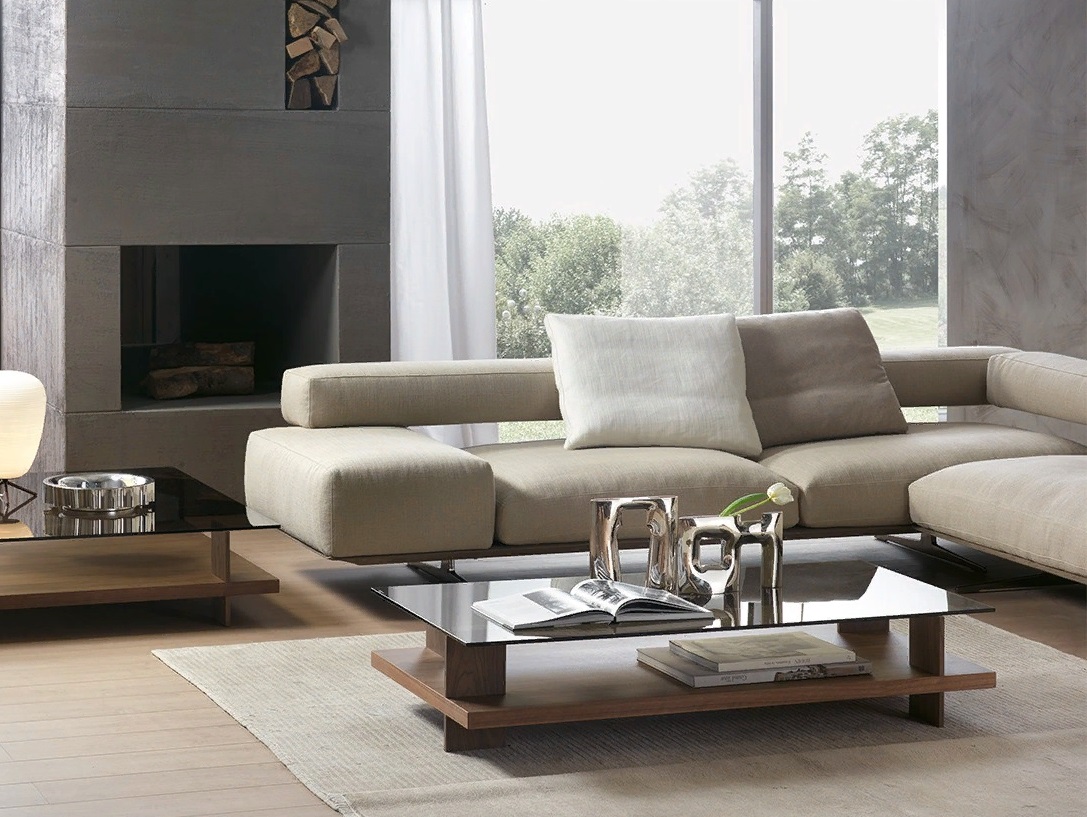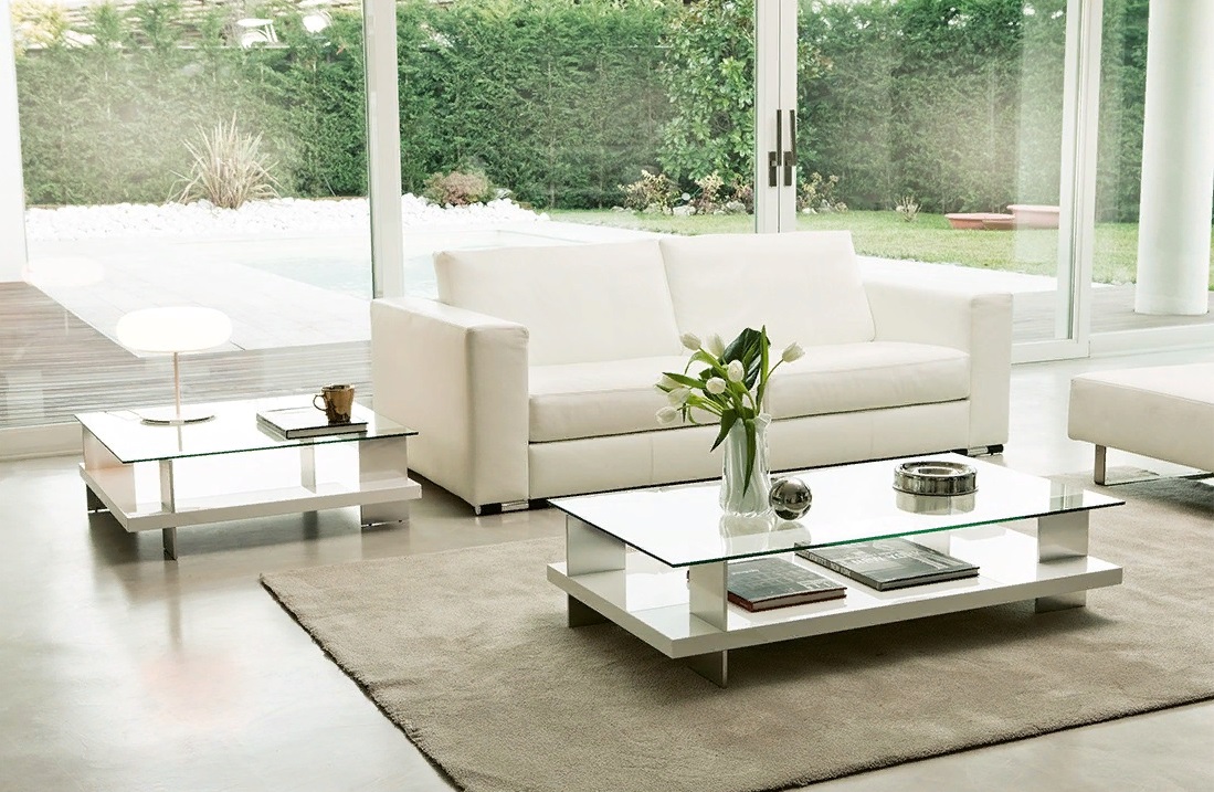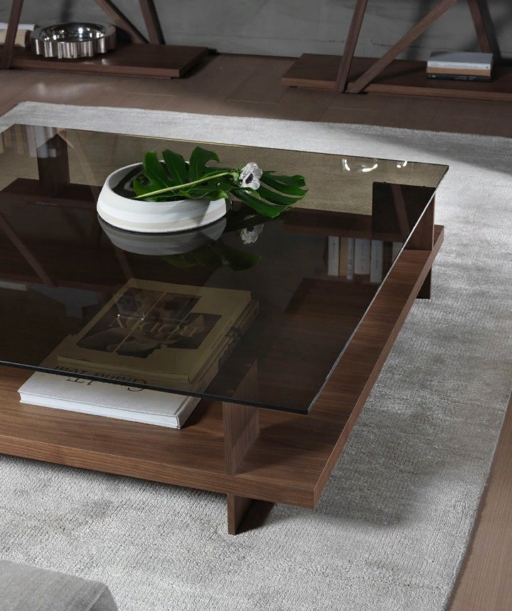 Tavolino rettangolare con ripiano, piano in vetro. Sono possibili diverse finiture.