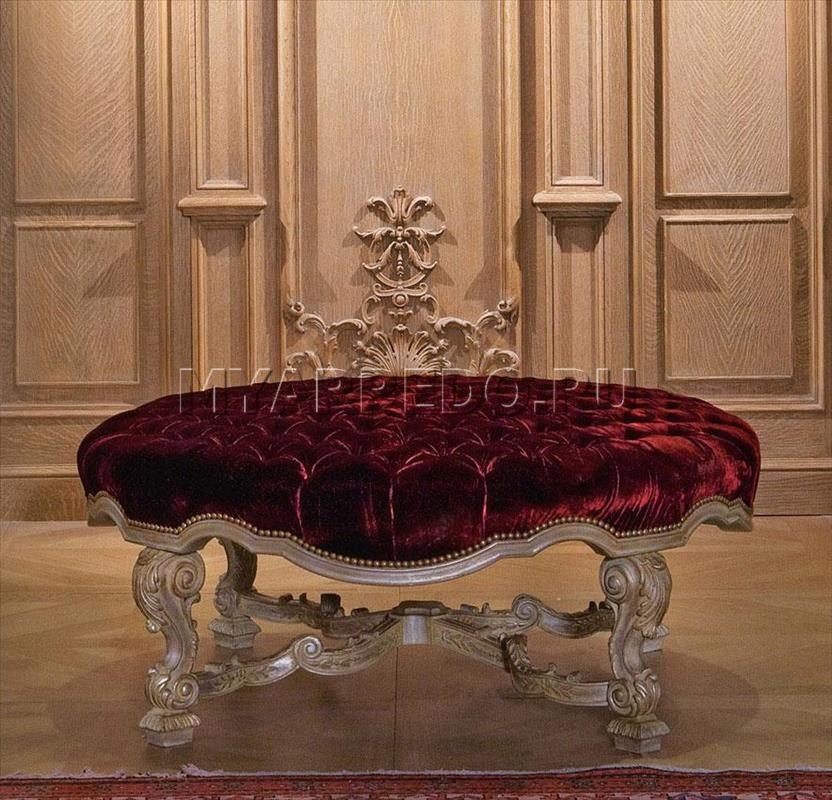 Pouf rotondo. Riempimento-poliuretano. Decorato con elementi intagliati. Sono possibili altre varianti di tappezzeria e finiture.