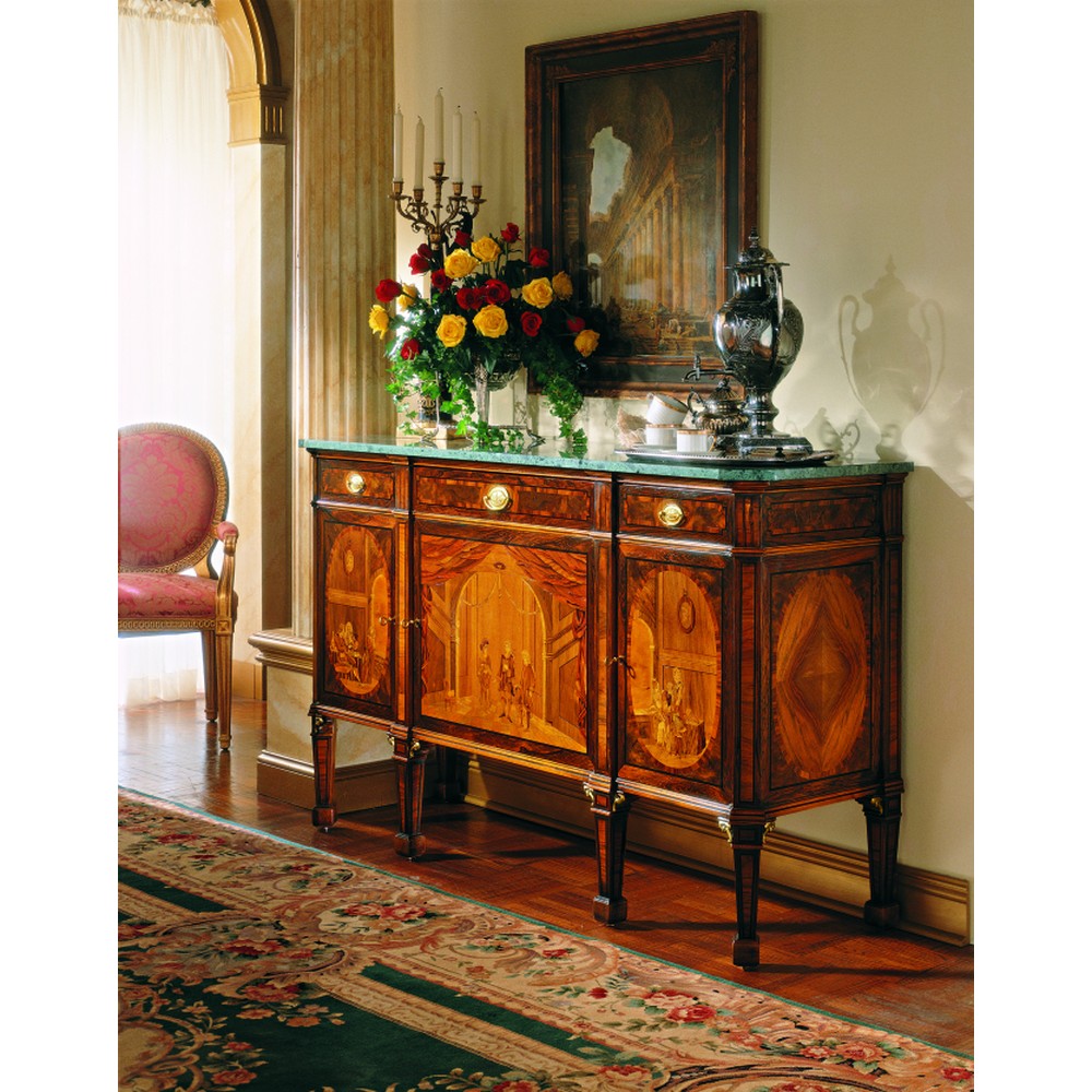 Cassettiera con elementi in intarsio. Piano di lavoro in marmo.