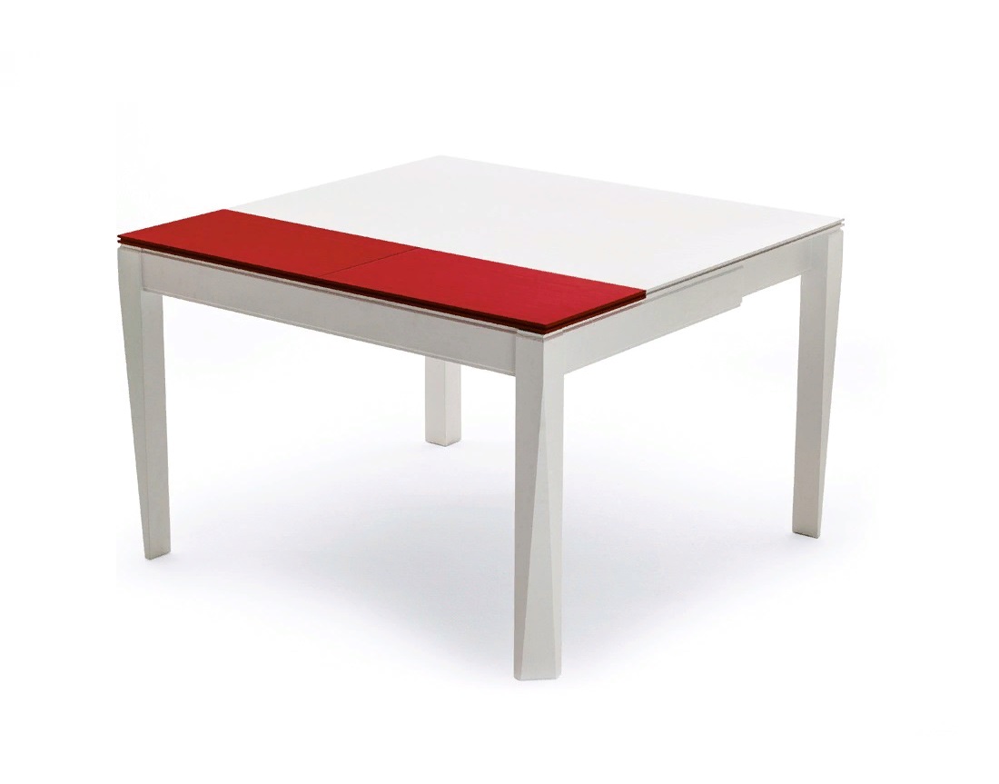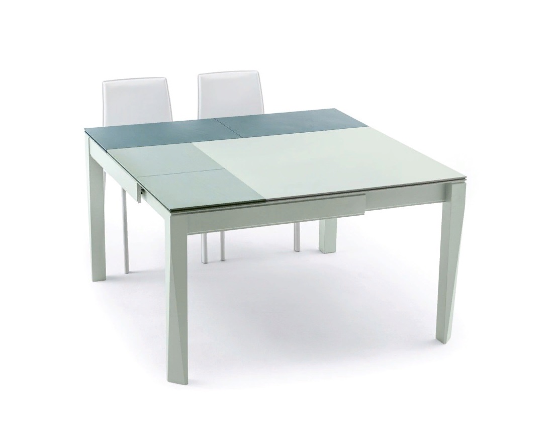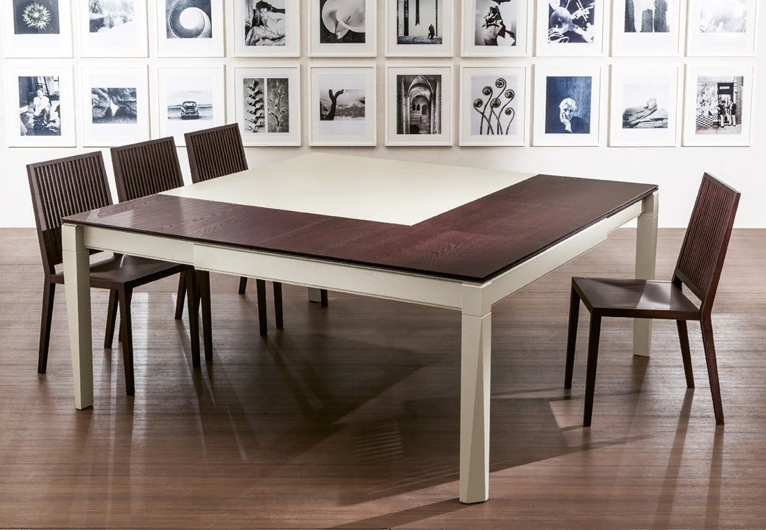 Tavolo pieghevole quadrato. Il tavolo è disposto in lunghezza e in larghezza con l'aiuto di inserti. La dimensione massima del tavolo è 175x175x75 cm.