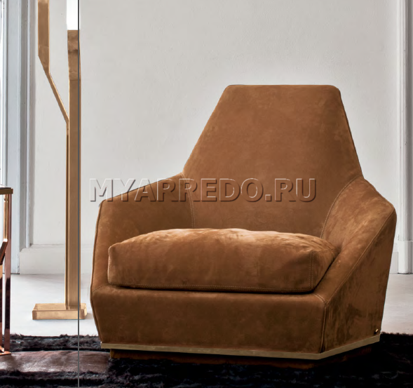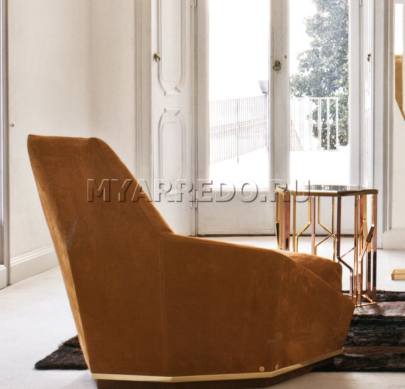 Croslo in tappezzeria nubuck è rappresentato dalla fabbrica LONGHI (F. lli LONGHI). Sono possibili altre opzioni di finitura (tessuto, pelle). Telaio in legno con cinghie elastiche, rivestito in poliuretano espanso ad alta densità e varie rigidità. Cuscini di seduta sono pieni di sterile d'oca, hanno un inserto in poliuretano espanso di diversa durezza, fortificata particolare imbottiture materiale «Visco Soft». La base in legno è rivestita con lo stesso materiale di cui è fatta la tappezzeria. L'anello di finitura della base è realizzato in ferro e ha una finitura oro chiaro lucido. A causa della particolare lavorazione, il rivestimento del telaio sia in pelle che in tessuto non è rimovibile; il rivestimento del sedile in tessuto è rimovibile.