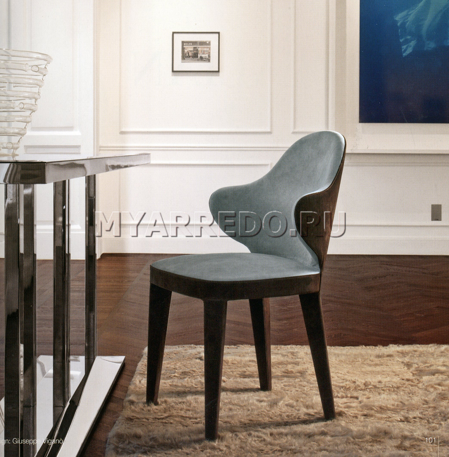 Sedia in rivestimento nubuck, presentato dalla fabbrica di LONGHI (F. lli LONGHI). Sono possibili altre opzioni di tappezzeria (Tessuto, pelle). Struttura in legno, schienale in compensato di faggio. Imbottitura in poliuretano espanso. La tappezzeria non è rimovibile.
