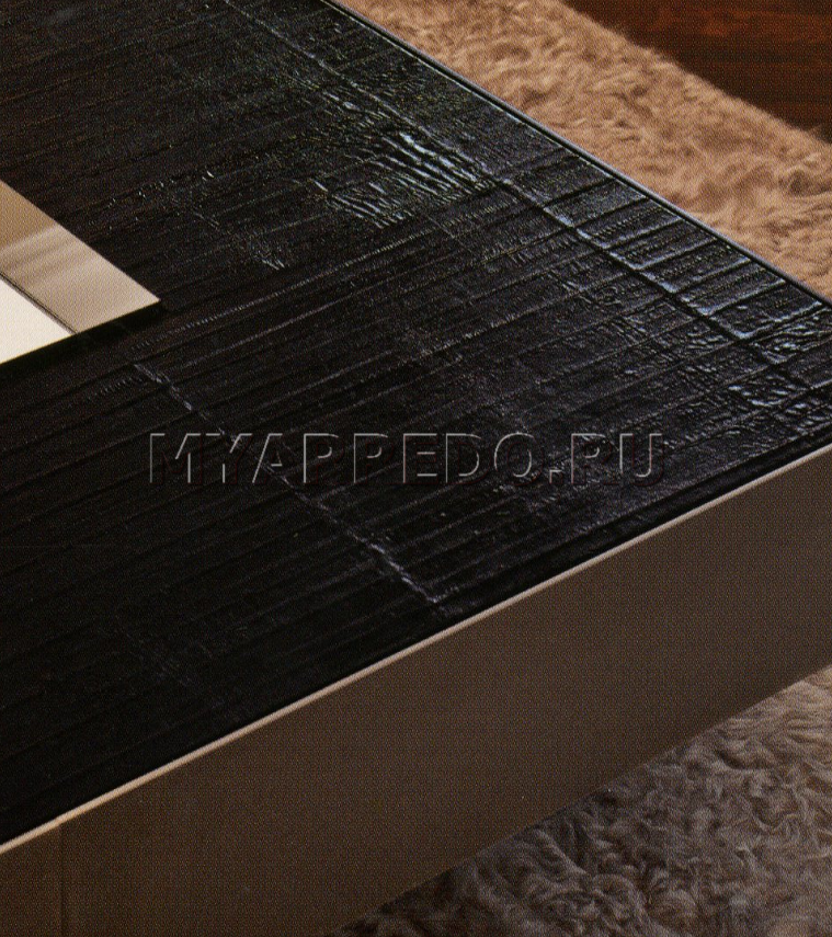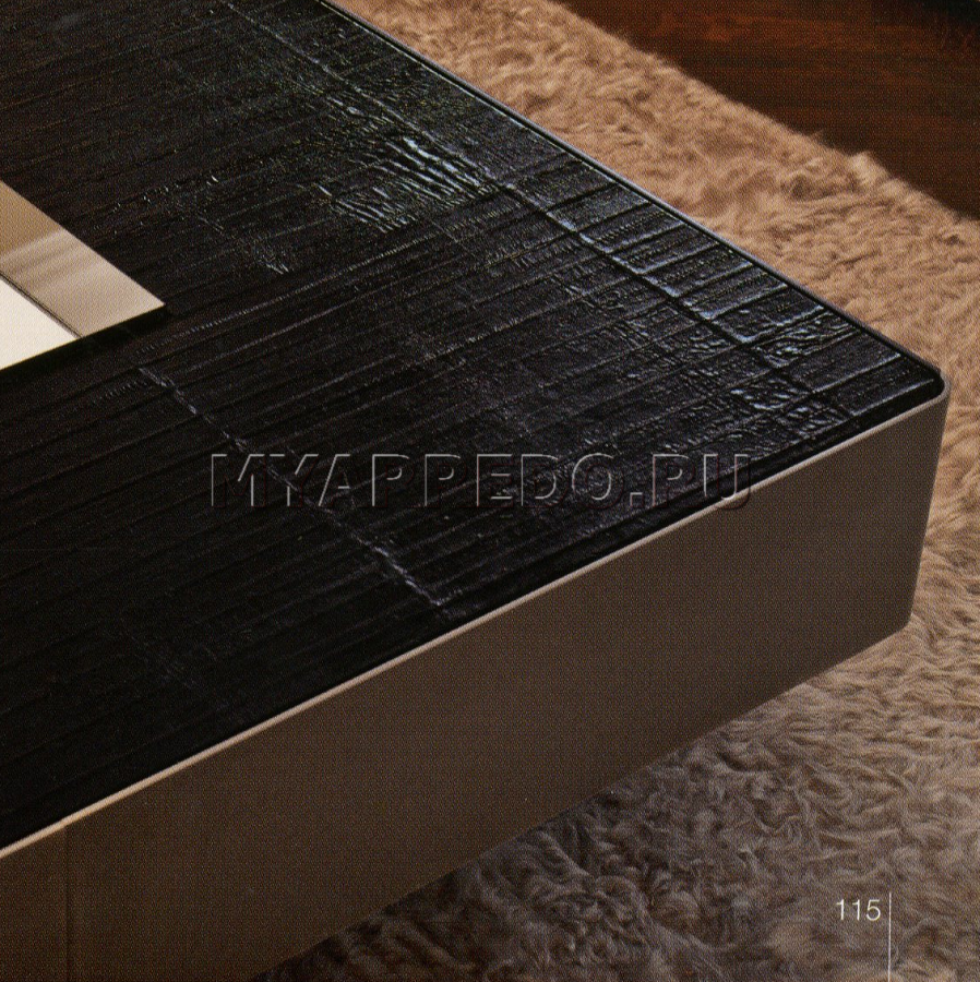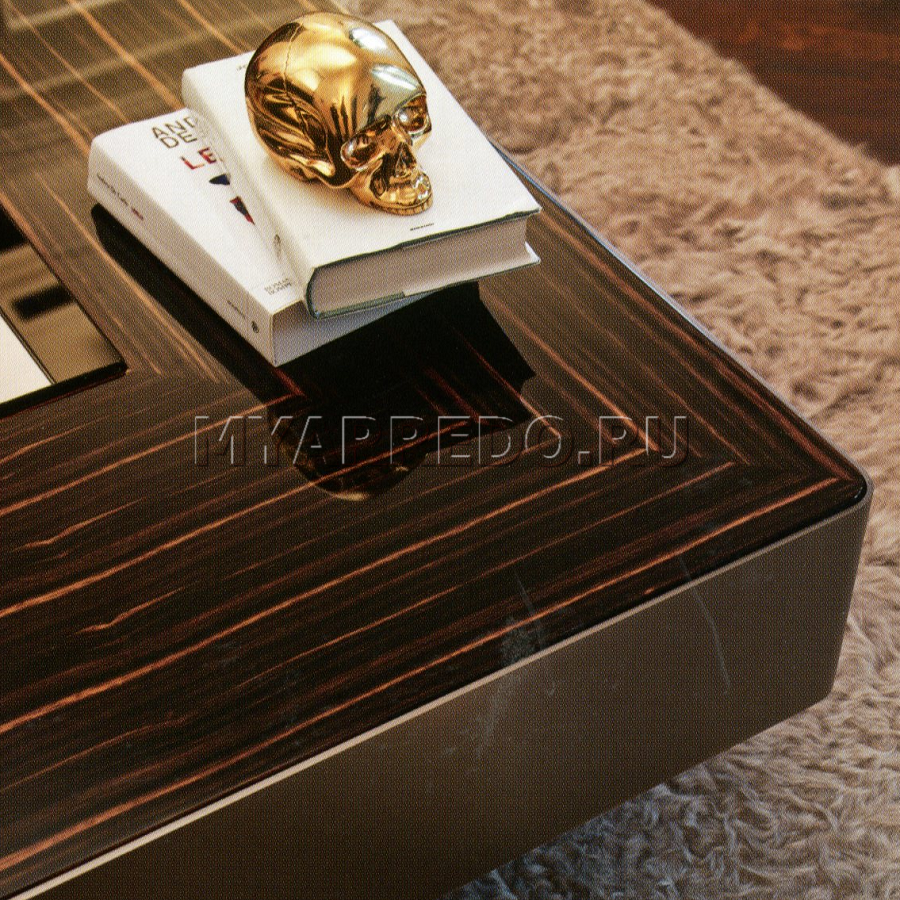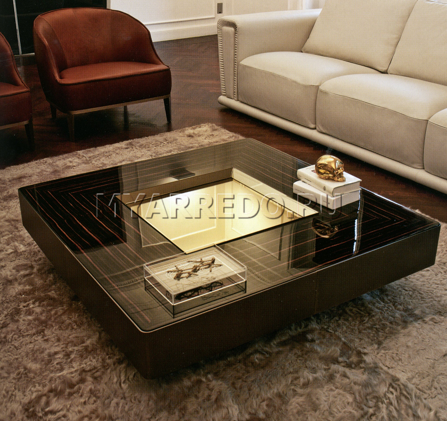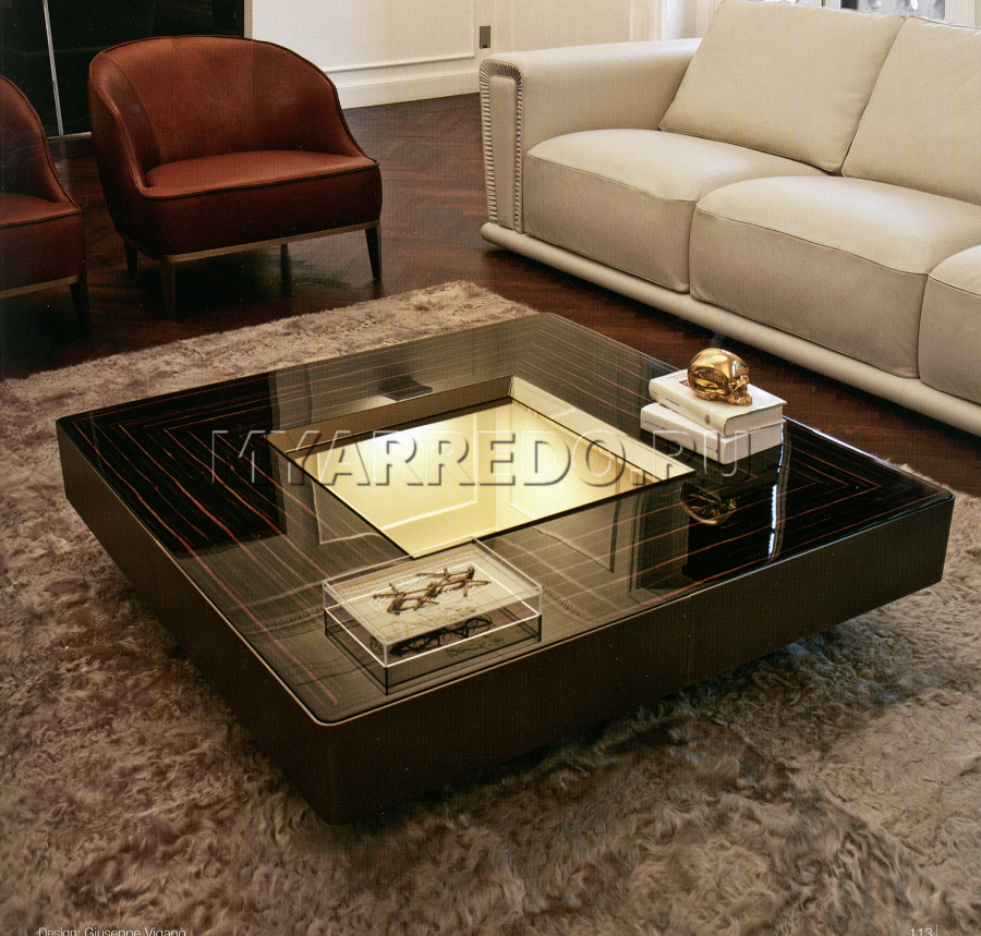 Tavolino, quadrato, in ebano e cromo nero lucido, presentato dalla fabbrica LONGHI (F. lli LONGHI). Sono possibili altre finiture. Tavolino con vassoio al centro, rivestito con specchio in bronzo fumé.