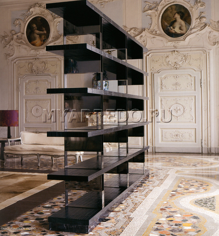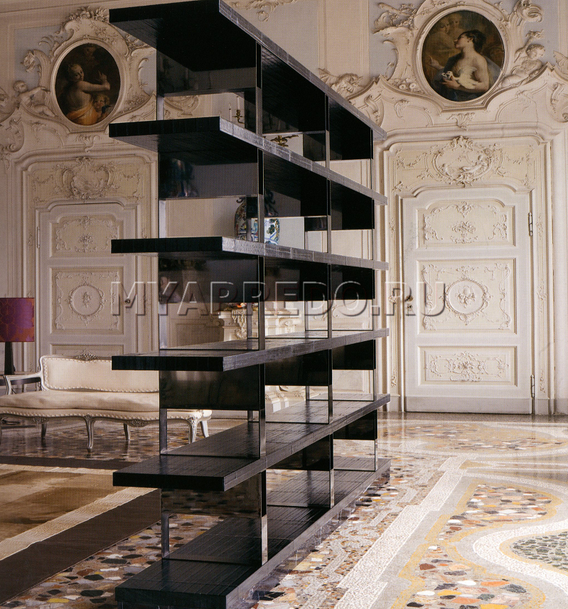 Lo scaffale è rappresentato dalla fabbrica LONGHI (F. lli LONGHI).Scaffalatura prefabbricata composta da ripiani a due lunghezze e assemblata tramite supporti / divisori in metallo rivestito in pelle. Finitura pareti divisorie in ferro cromo lucido. Base in marmo.