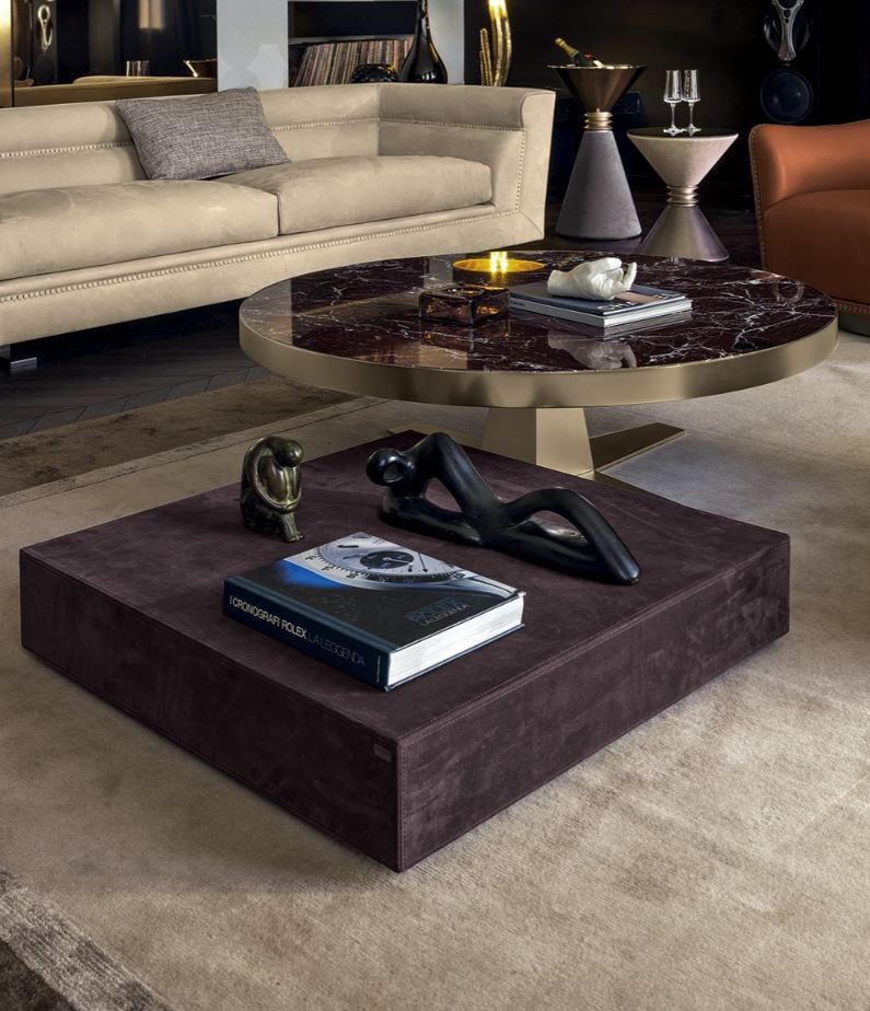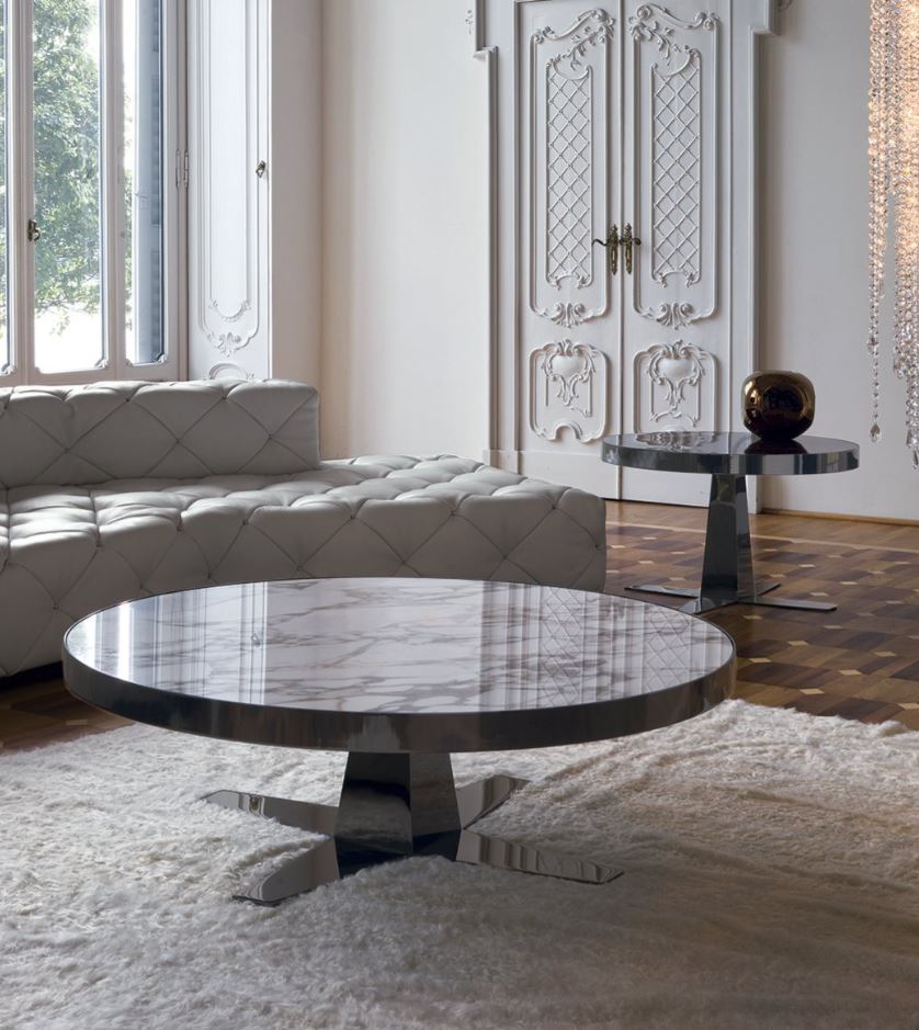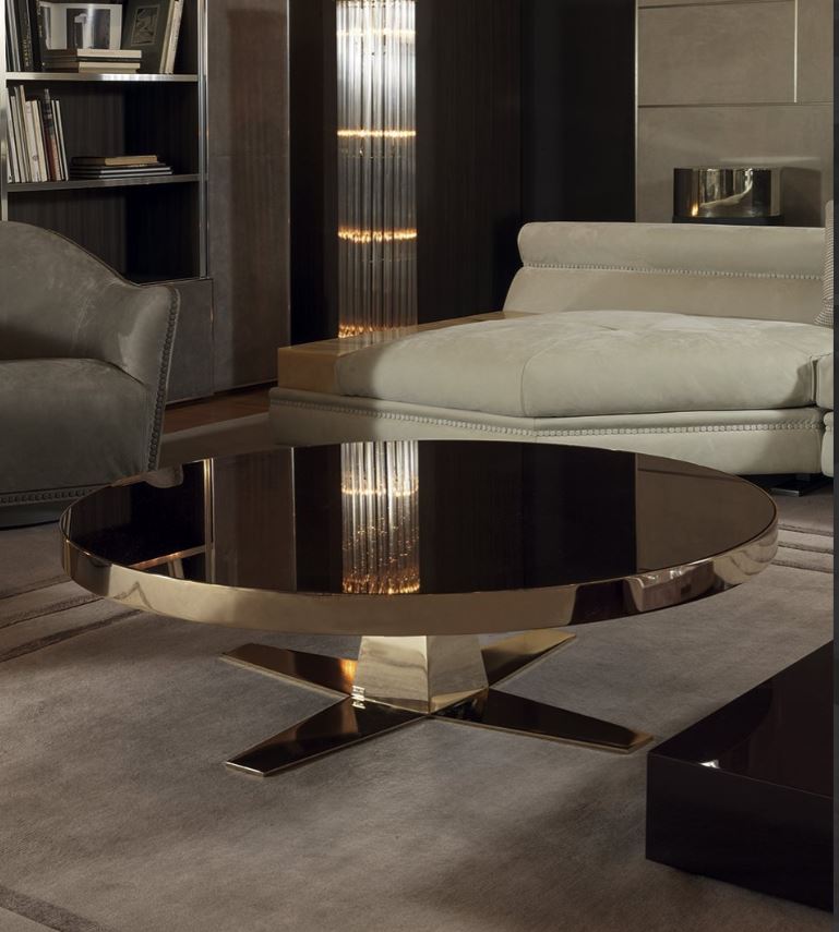 Tavolino, rotondo, finitura base in bronzo satinato opaco, con piano in marmo presentato dalla fabbrica LONGHI (F. lli LONGHI). Sono possibili altre opzioni di finitura.