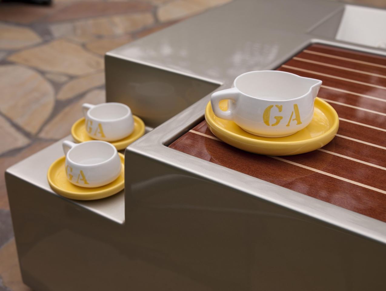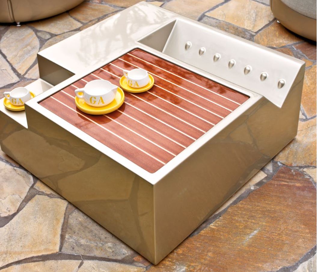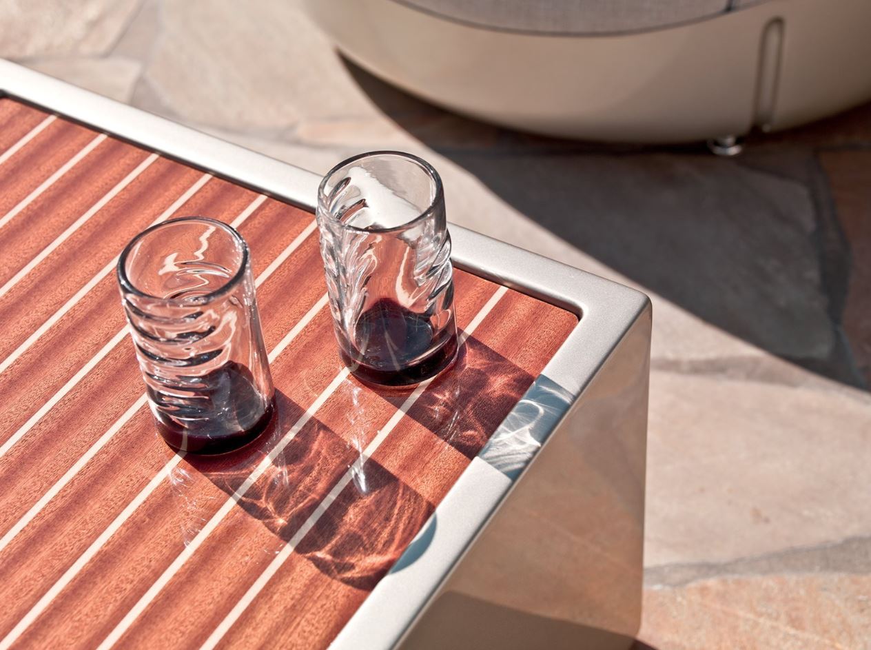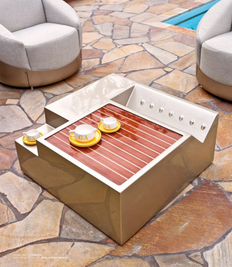 Il telaio del tavolo in fibra di vetro è rappresentato dalla fabbrica LONGHI (F. lli LONGHI). Il telaio esterno è rivestito in gel, verniciato in bronzo metallizzato. Il prodotto è destinato all'uso esterno.