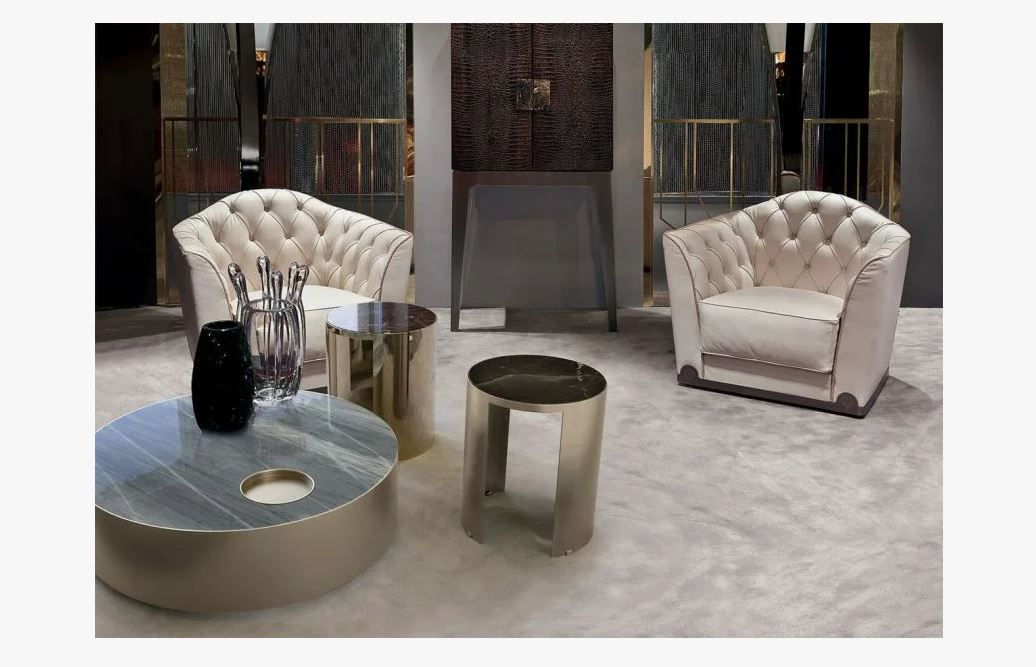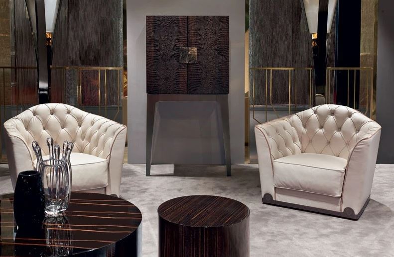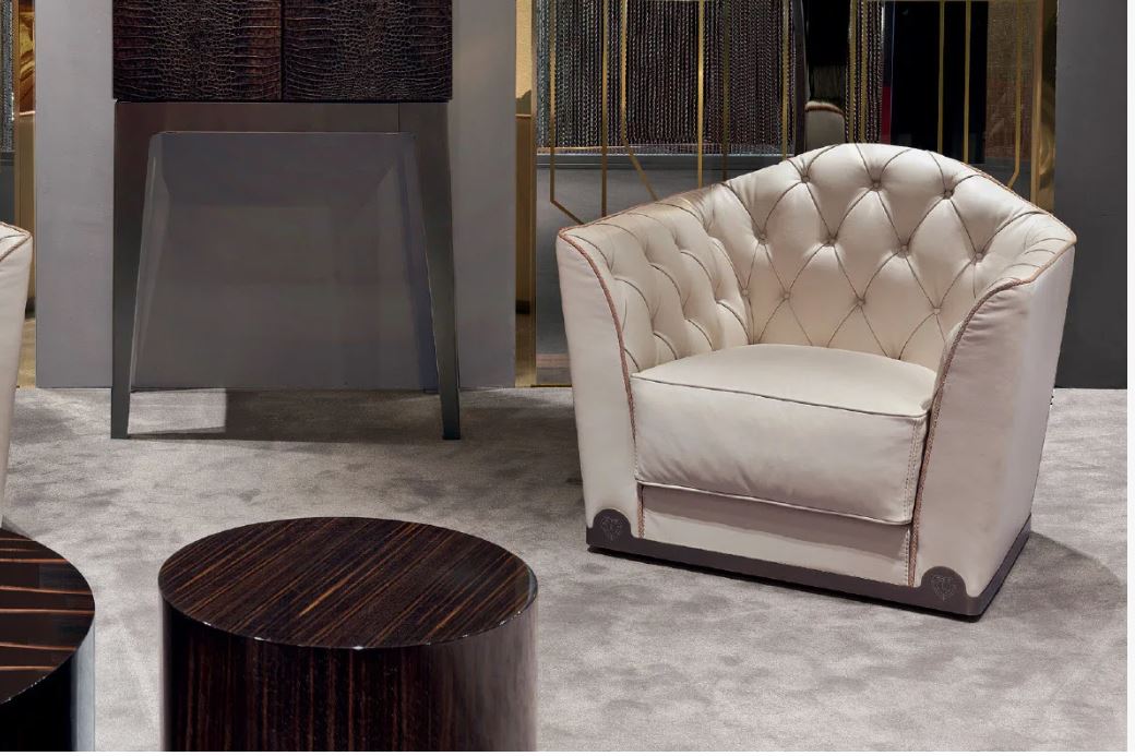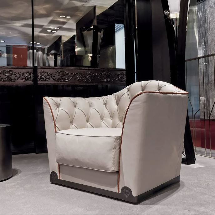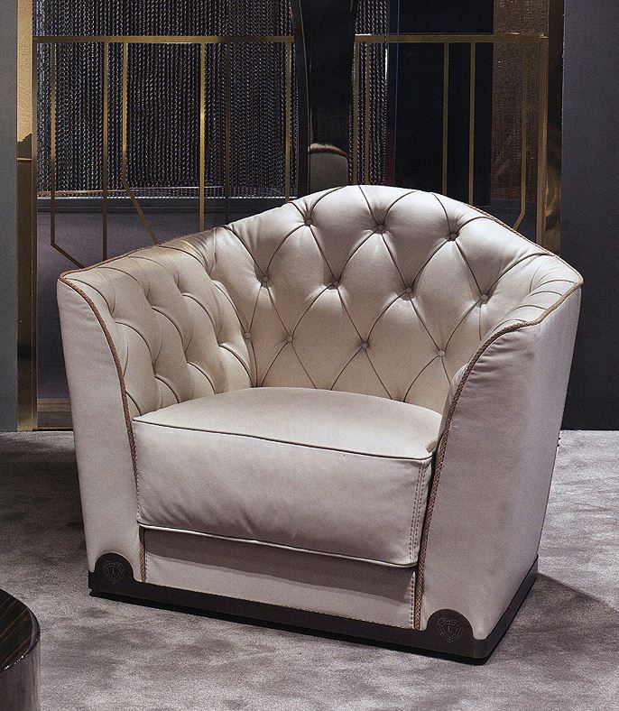 Poltrona in pelle con bordo in pelle presentata dalla fabbrica LONGHI (F. lli LONGHI). Il telaio in legno con cinghie elastiche è rivestito in poliuretano espanso di varie rigidità. Cuscino pieno di sterile piuma d'oca, dotato di un inserto in poliuretano espanso di diversa durezza e rafforzata particolare imbottiture materiale «visco Soft», che si distingue per la morbidezza e ad alta resistenza. Lo schienale interno ha una finitura capitonné con bottoni in colore tappezzeria o con cristalli «Swarovski». Il divano può avere un bordo di pelle intrecciata di medicazione fine. A causa del trattamento speciale, la tappezzeria del telaio sia in pelle che in tessuto è fissa. Alla base del divano c'è una bordatura metallica con logo inciso a laser, che ha le seguenti finiture: Cromo Lucido, Cromo Nero Lucido, Oro Chiaro, Oro Opaco Champagne e bronzo satinato opaco.
