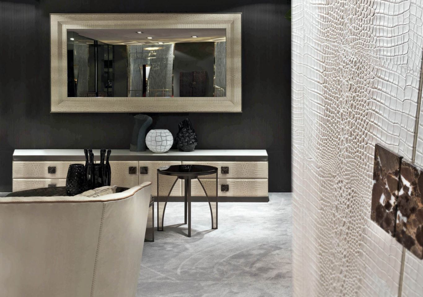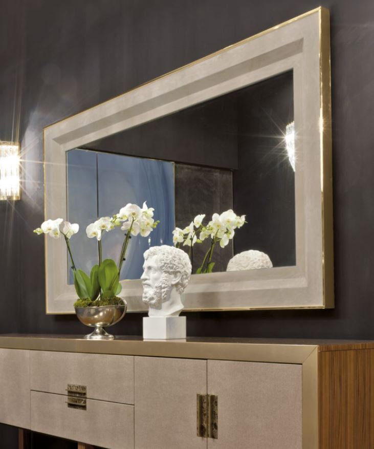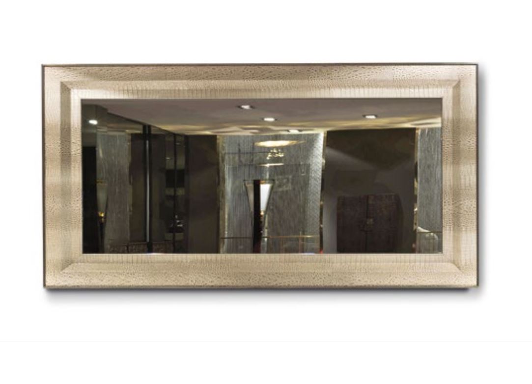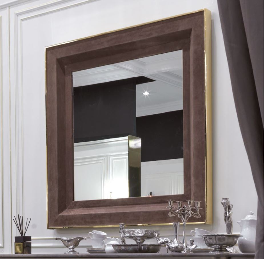 Specchio nel rivestimento cuoio, rappresentato dalla fabbrica di LONGHI (F. lli LONGHI). Struttura in metallo spazzolato finitura bronzo satinato opaco.
