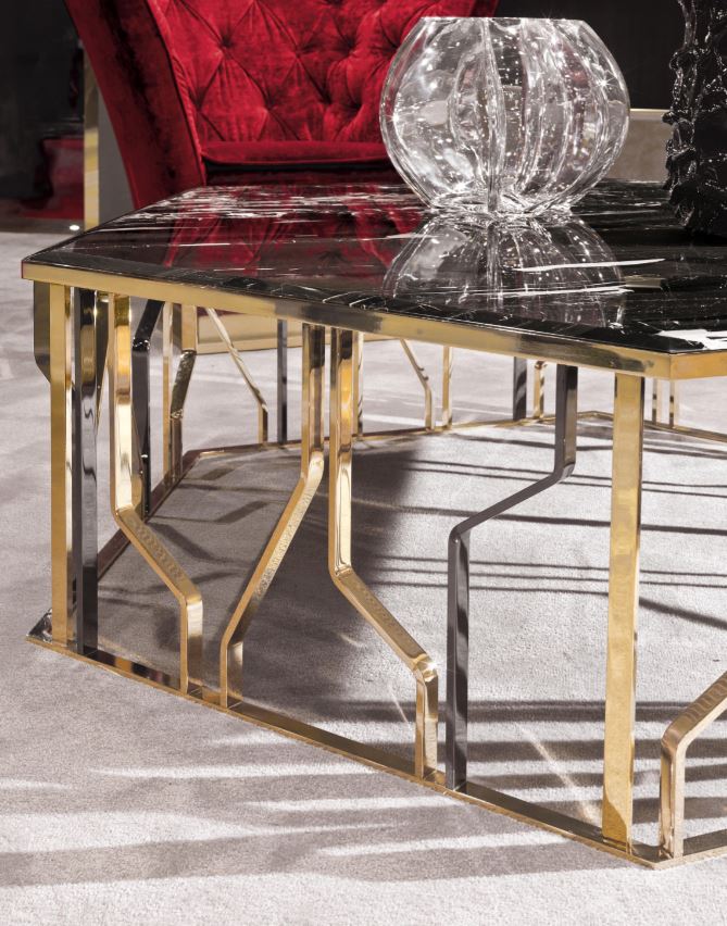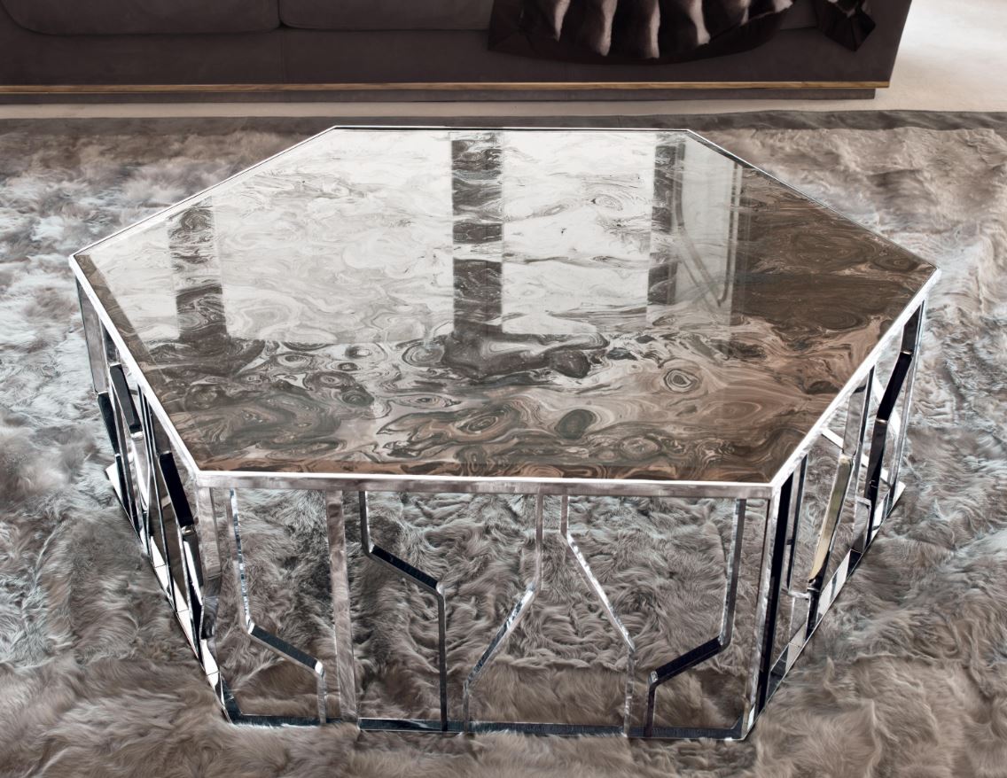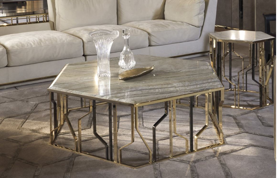 Tavolino, esagonale, in finitura oro chiaro, piano in marmo rappresentato dalla fabbrica LONGHI (F. lli LONGHI). Sono possibili altre finiture.