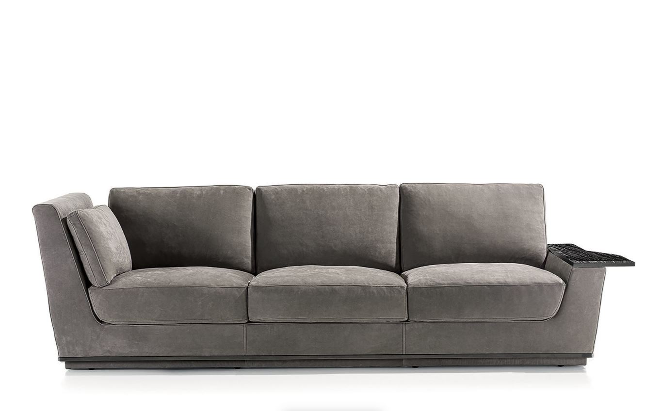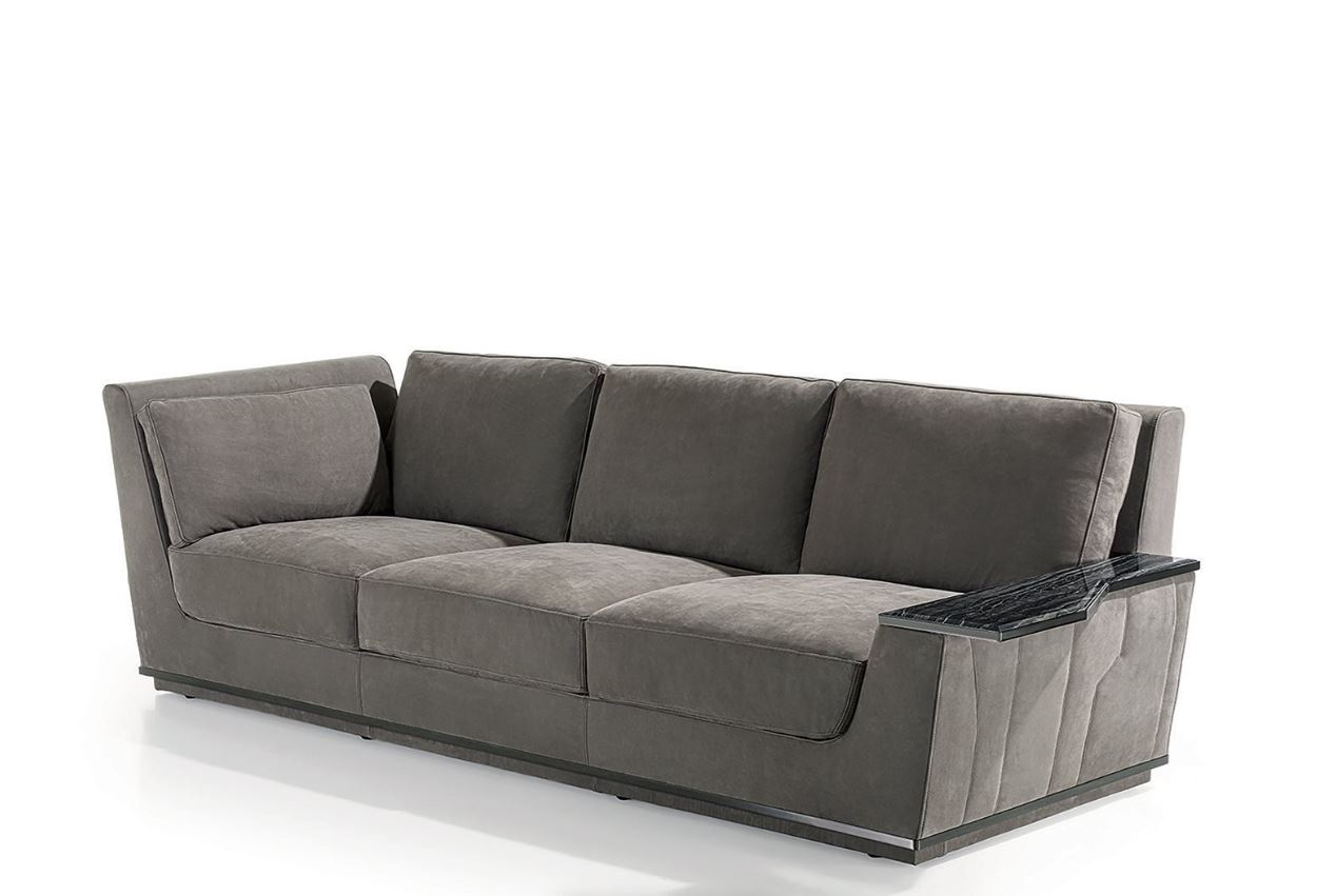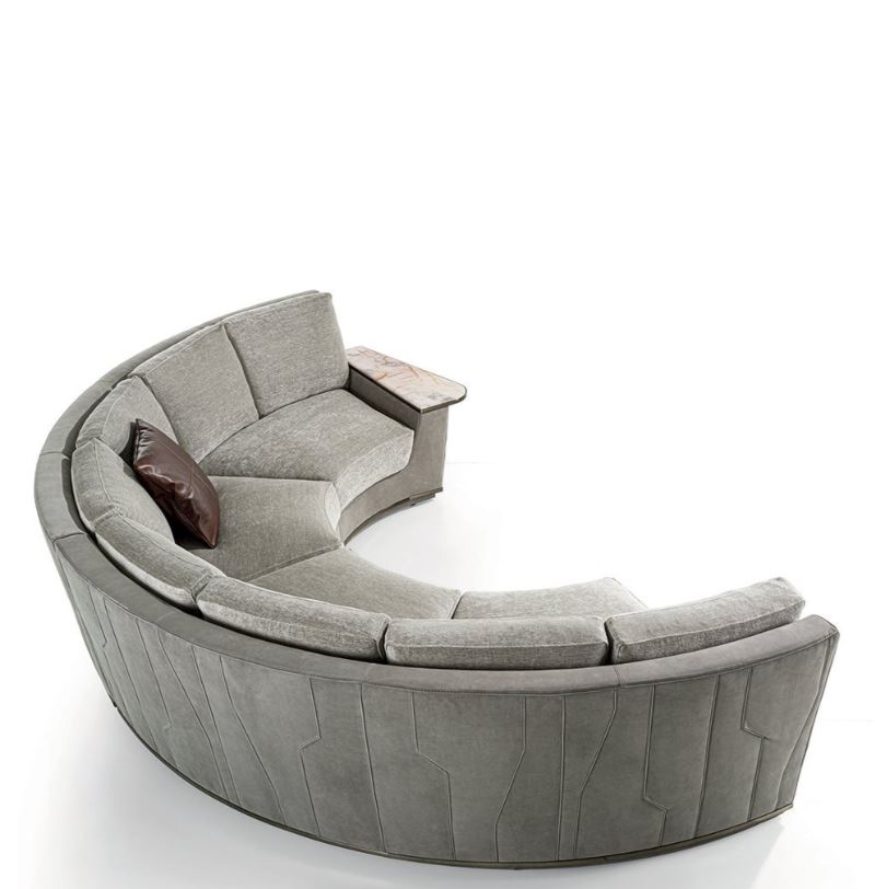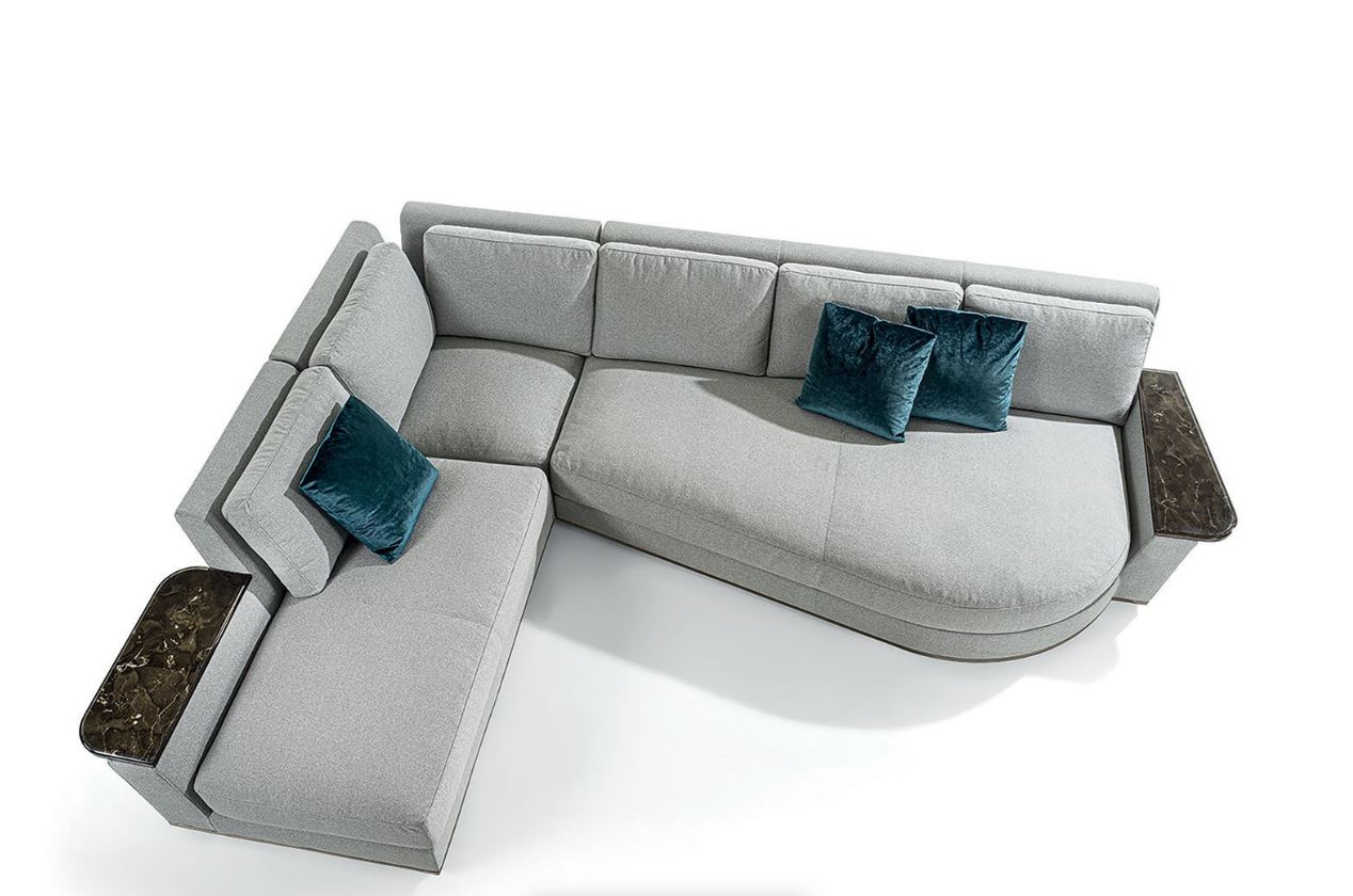 Divano modulare, angolare, in tappezzeria nubuck. Struttura in legno, imbottitura in poliuretano espanso. Nei cuscini del sedile e dello schienale c'è una piuma d'oca. Sono possibili altre opzioni di allestimento e finitura.