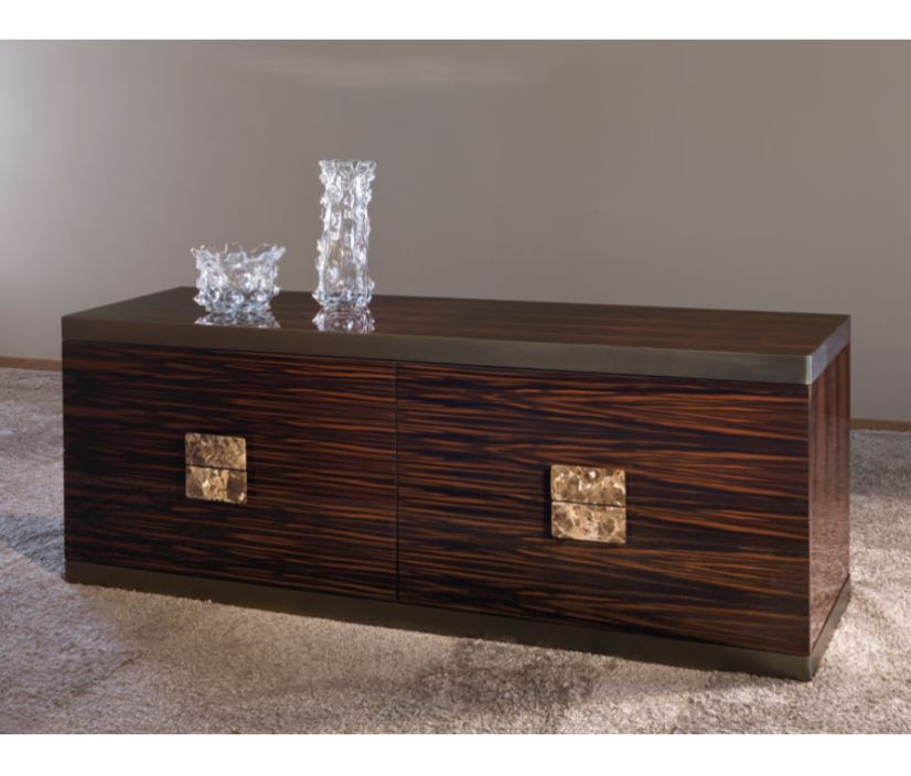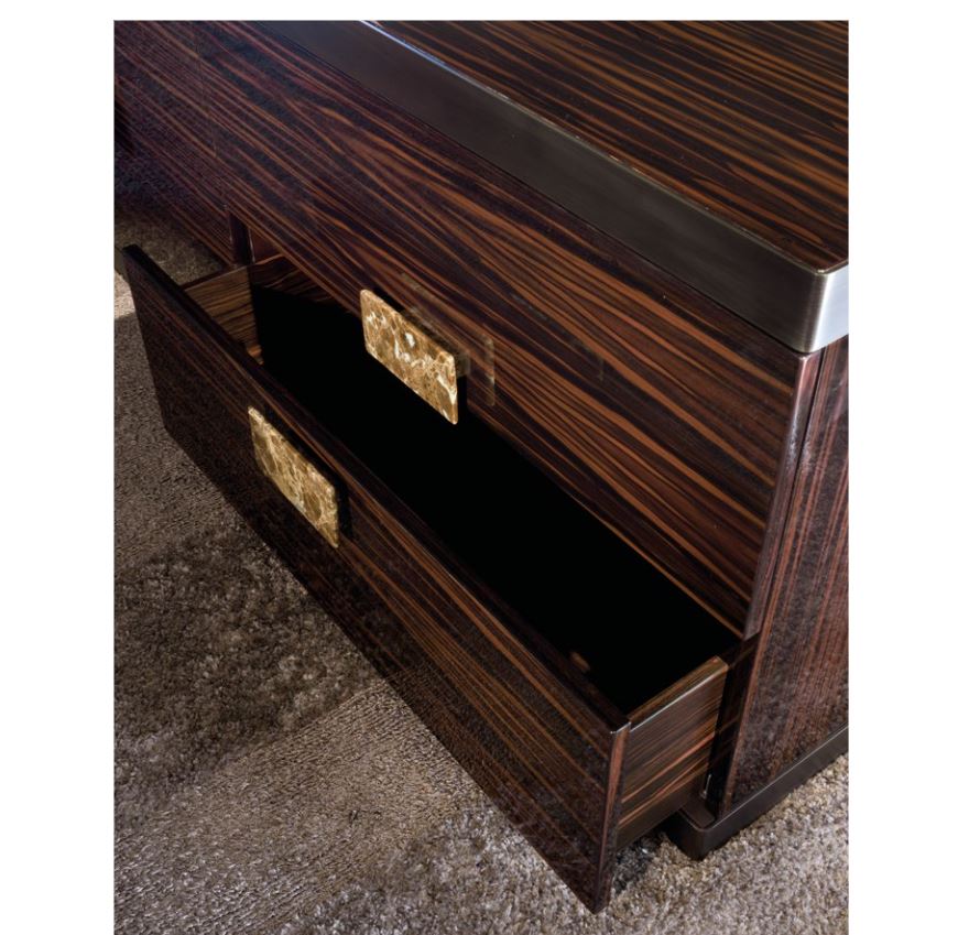Cassettiera in finitura ebano, presentata dalla fabbrica LONGHI (F. lli LONGHI). Pannello-bronzo satinato. Maniglie in marmo.