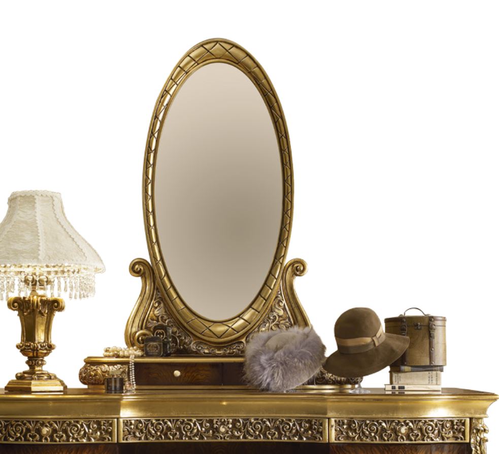 Lo specchio ovale da tavolo su supporto decorato con baguette in legno intagliato è presentato dalla fabbrica A. R. ARREDAMENTI SRL nella collezione CELEBRITY. Lo specchio è realizzato in stile classico, la baguette è realizzata in legno massello naturale e decorata con sculture artistiche fatte a mano