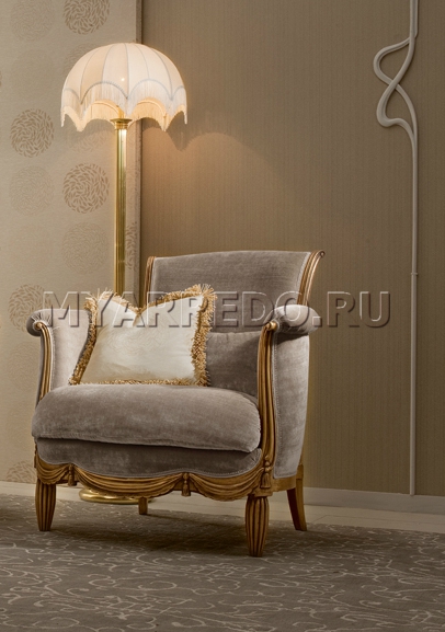 La poltrona decorata con elementi intagliati è presentata dalla fabbrica MEDEA della collezione Liberty collection. Tappezzeria-tessuto, riempimento-poliuretano. Sono possibili altre finiture e rivestimenti, è disponibile l'ordine del prodotto con tappezzeria in tessuto del cliente