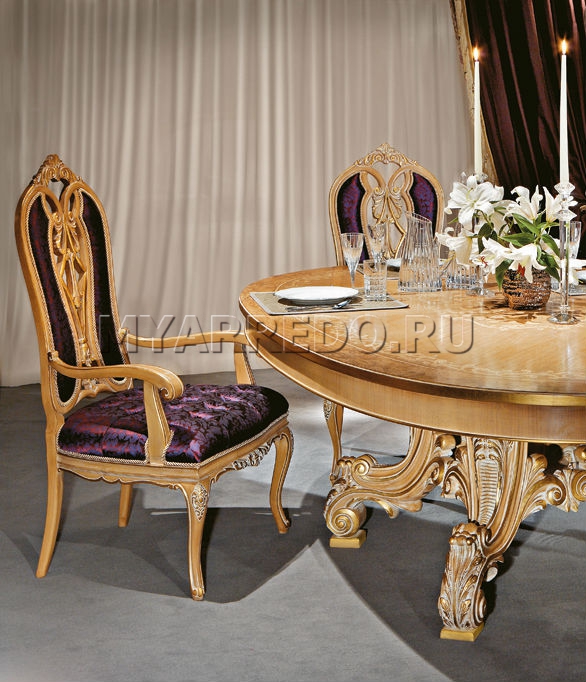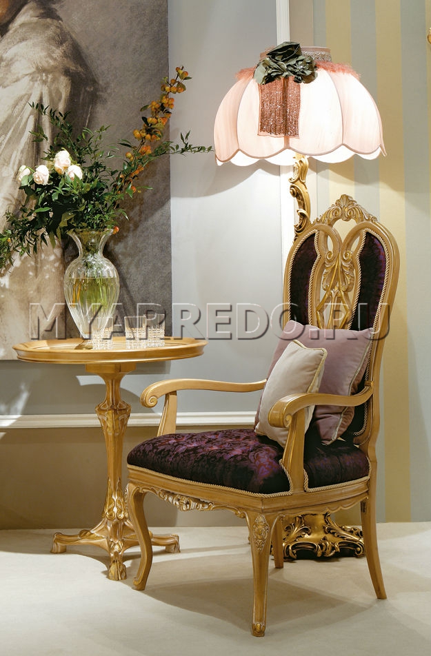 La sedia con seduta imbottita, gambe curve e braccioli sagomati a forma di riccioli è presentata dalla fabbrica MEDEA nella collezione Prestige. Lo schienale alto è decorato con elementi intagliati e rivestito in tessuto, il riempimento è in poliuretano. Sono possibili altre finiture e rivestimenti