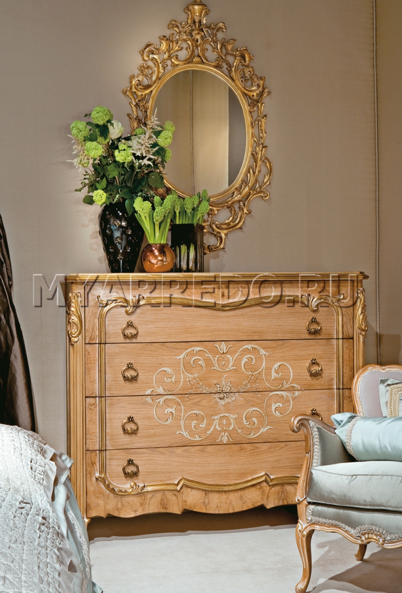 Il comò con quattro cassetti, decorato con elementi intagliati e intarsi è presentato dalla fabbrica MEDEA nella collezione Prestige. Sono possibili altre finiture.