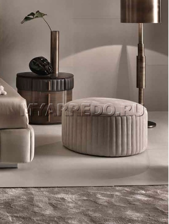 Pouf, presentato in stile art deco dalla fabbrica italiana SIGNORINI COCO & amp; amp; c, collezione Daytona. Il pouf è rivestito con un panno. Sono possibili altre varianti di tappezzeria.