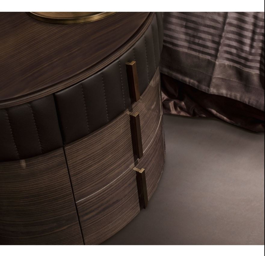 Comodino, presentato in stile art deco dalla fabbrica italiana SIGNORINI COCO & amp; amp; c, collezione Daytona. La struttura è impiallacciata in noce. Il cassetto superiore e l'area intorno ad esso sono rivestiti in pelle. Maniglie in ottone.