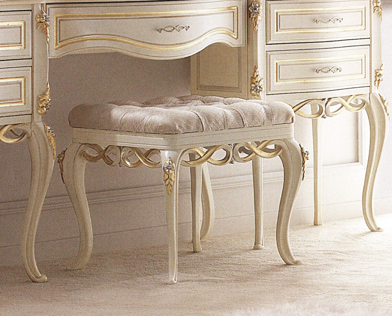 Pouf, presentato in stile classico dalla fabbrica italiana SIGNORINI COCO & amp; amp; c, collezione Forever. Realizzato in legno massello, decorato con elementi intagliati. Il sedile è rivestito in tessuto, cucito capitone.