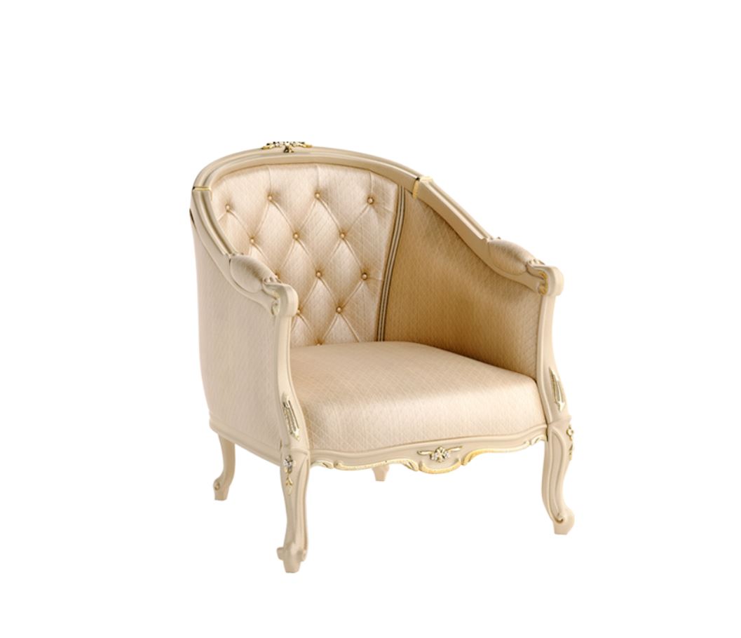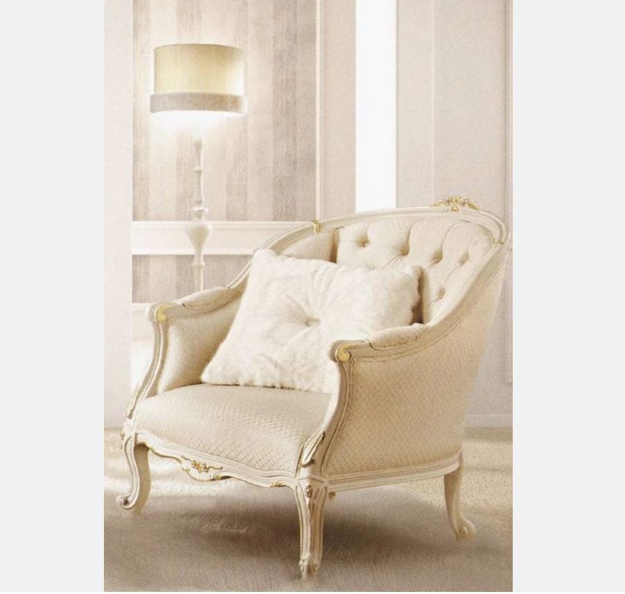Poltrona, presentata in stile classico dalla fabbrica italiana SIGNORINI COCO & amp; amp; c, collezione Forever. Realizzato in legno massello, il sedile e lo schienale sono rivestiti in tessuto, lo schienale è cucito capitone. Sono possibili altre finiture e rivestimenti.