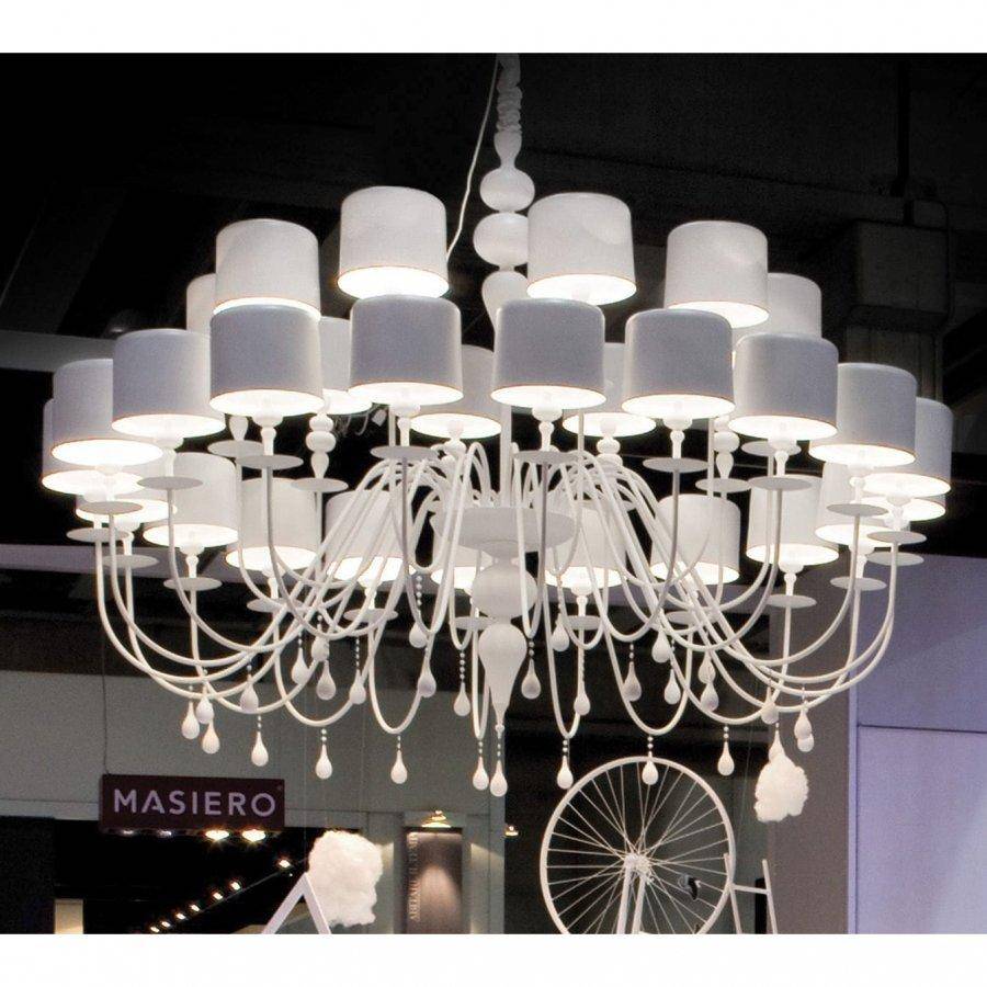 Il lampadario a sospensione, realizzato in bianco, con una struttura portante in plastica laccata e poliuretano, è presentato dalla fabbrica italiana MASIERO nella collezione ECLETTICA. Il lampadario è decorato in stile art deco, i lampadari sono realizzati in alluminio laccato. Il numero di lampadine sul lampadario ha trenta pezzi. Il lampadario può essere realizzato in finitura: argento e lamina d'oro, bianco opaco, nero laccato, arancione e fucsia