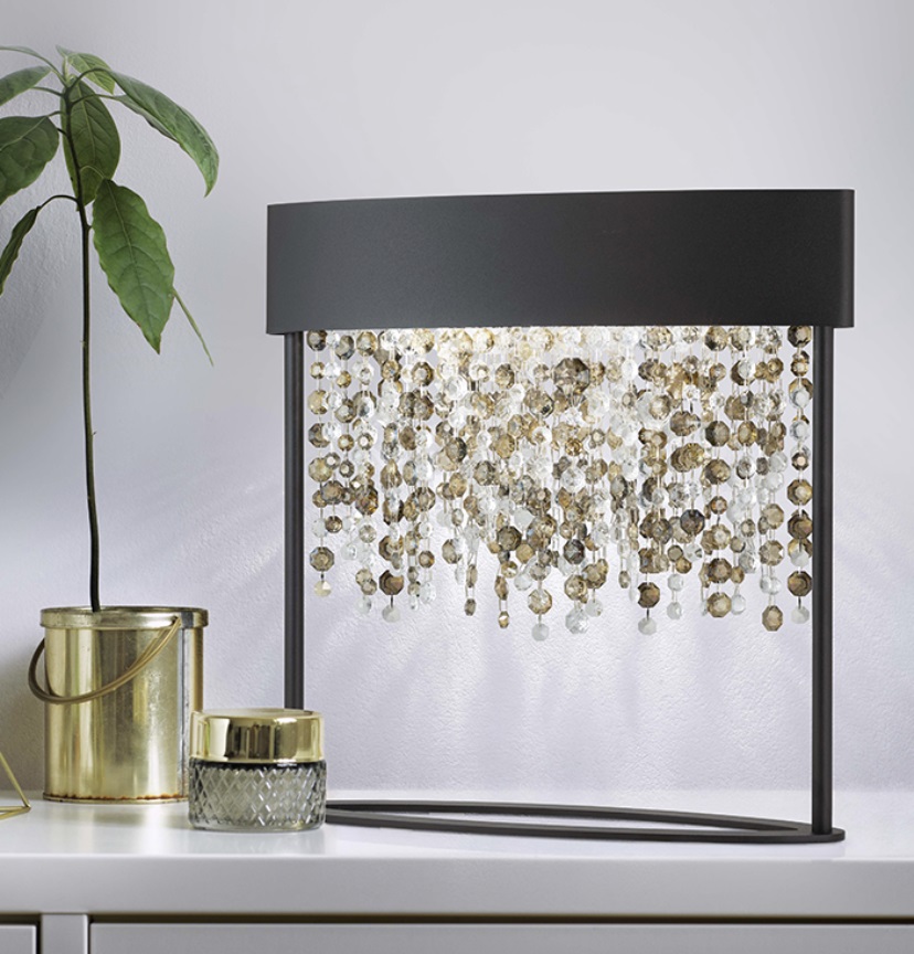 La lampada da tavolo con struttura in metallo laccato, decorata con pendenti in vetro verniciato italiano è presentata dalla fabbrica italiana MASIERO nella collezione ECLETTICA. La lampada è realizzata in stile art deco ed è dotata di due lampadine. Su richiesta del cliente è disponibile l'ordine del prodotto, nelle finiture: bianco opaco e bronzo, così come Lamina d'oro e d'argento