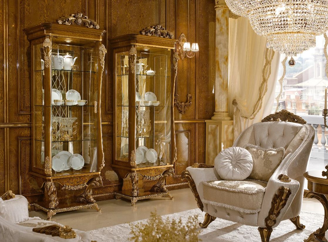 La vetrina a una porta in stile classico sulle gambe, realizzata sotto forma di bizzarri riccioli, è presentata dalla fabbrica A. R. ARREDAMENTI SRL della collezione Dolce Vita. La vetrina è dotata di ripiani in vetro e ripiano aperto nella parte inferiore, il suo design è realizzato in legno massello naturale con aggiunta di vetro e decorato con sculture artistiche fatte a mano