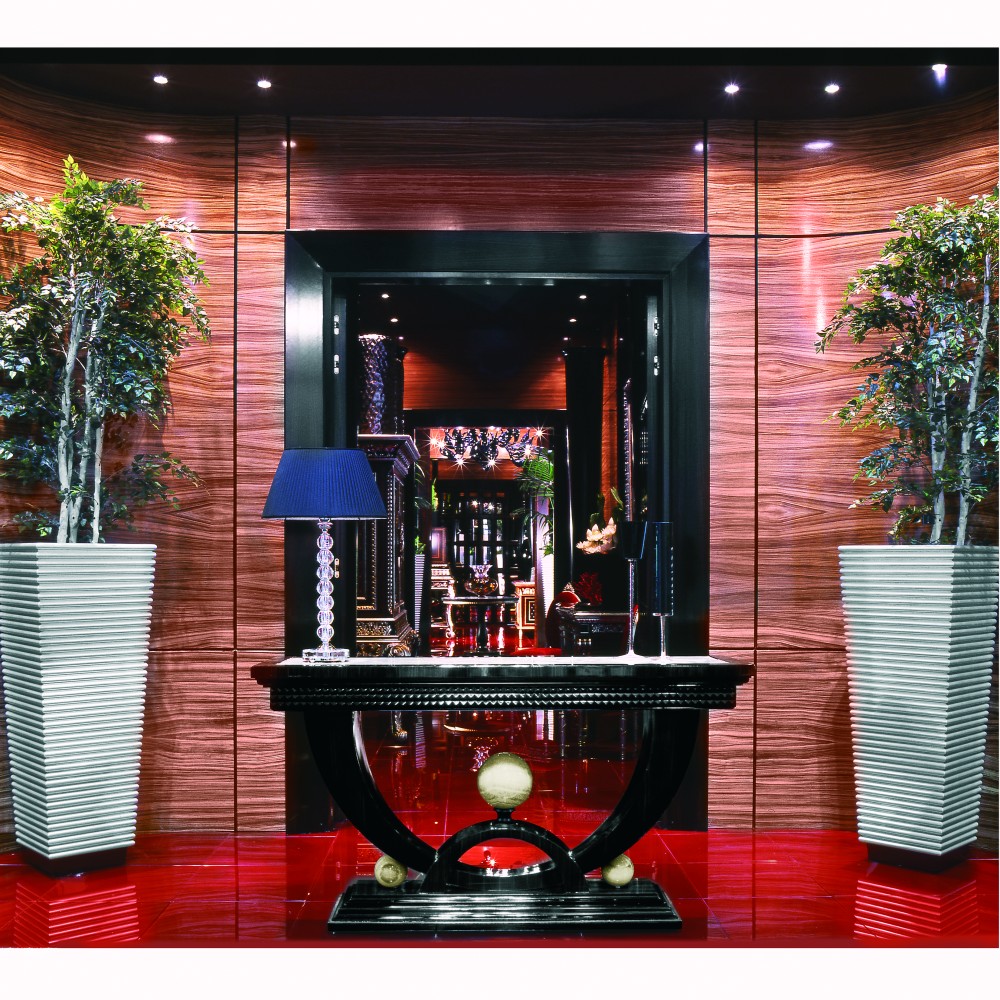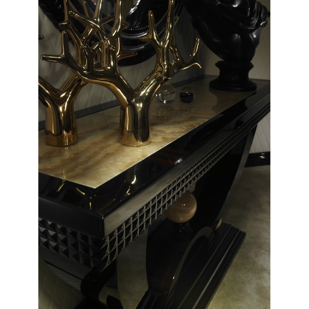 La console a parete è rappresentata dalla fabbrica italiana Francesco Molon nella collezione Eclectica. Decorato in stile art deco, realizzato in legno massello con una base decorata con una palla, realizzata in finitura "onice". Il modello può essere realizzato in altre finiture