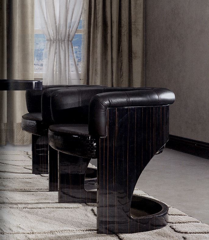 Lo stu con lo schienale arrotondato, posizionato a filo con lo schienale e rivestito in pelle, è presentato dalla Fabbrica Italiana Formitalia nella collezione Luxury group. Decorato in stile moderno, rivestito in vera pelle nera. La struttura della sedia è fatta di impiallacciatura in finitura & quot;Madagascar legno & quot;. Il design del modello è realizzato con il gioco sulle variazioni delle forme cilindriche ed è decorato con dettagli decorativi in metallo. Chelsea può essere realizzato in altre varianti di colore della tappezzeria in pelle