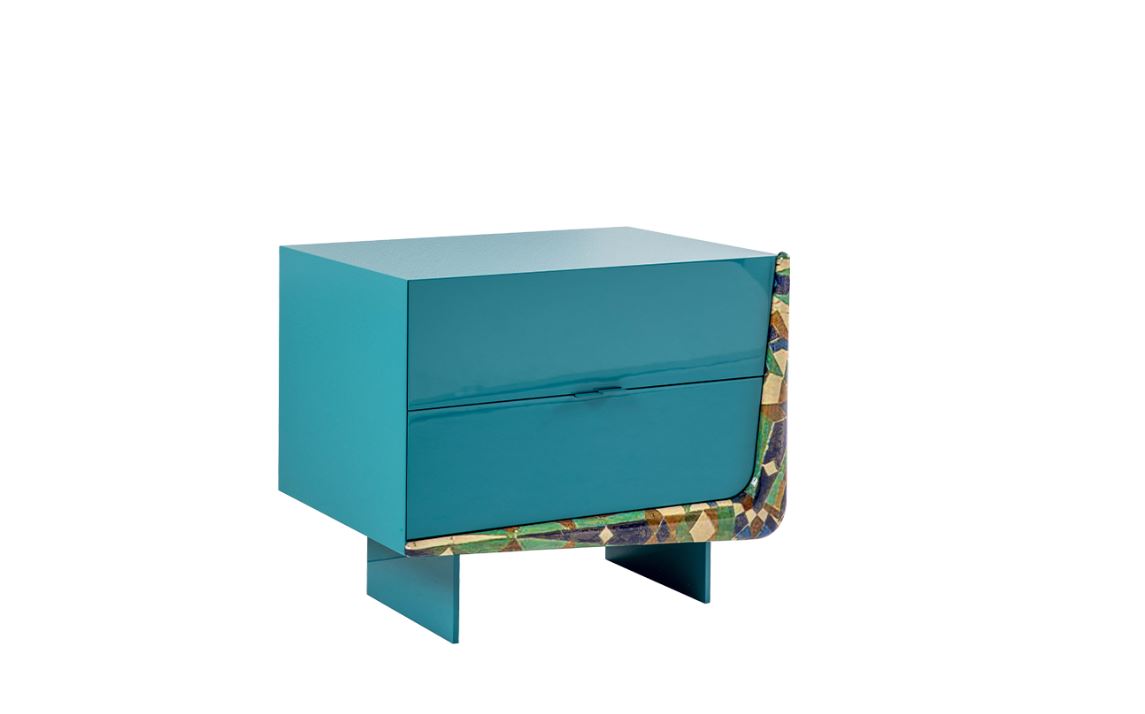 Sviluppo dello stabilimento SIGNORINI COCO. Comodino BOOMERANG factory DAYTONA collezione WONDERLAND. La struttura e i cassetti sono realizzati in multistrato rivestito di MDF verniciato. Decorazione cassetti, maniglie in acciaio laccato.