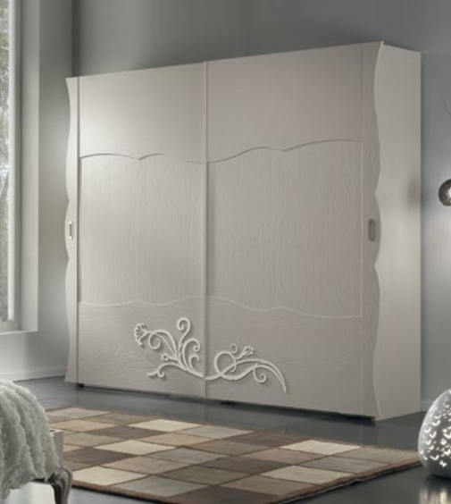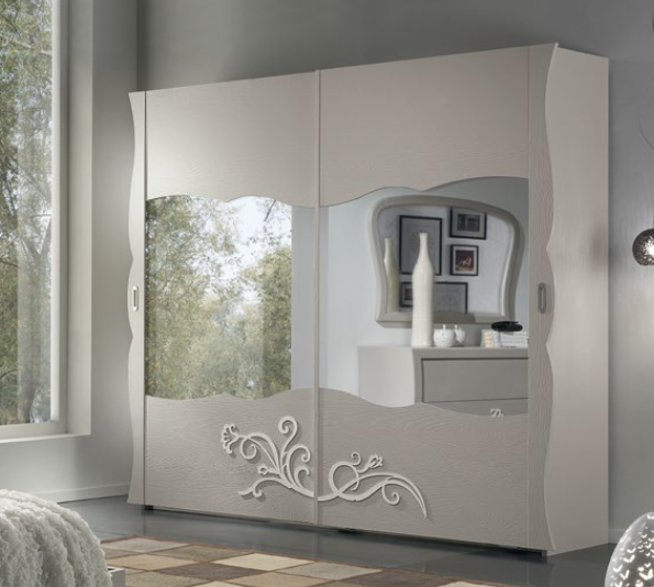 Mobile in frassino a 2 ante scorrevoli in legno con decoro in rilievo. È disponibile la versione contenitore con specchio sagomato senza decoro in rilievo e con specchio sagomato e decoro. Le finiture possono essere scelte dal campionario di fabbrica.