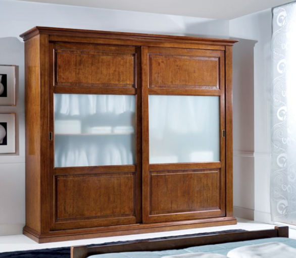Armadio scorrevole con 2 ante scorrevoli, cassettiera e vetro centrale. Le finiture possono essere scelte dal campionario di fabbrica.