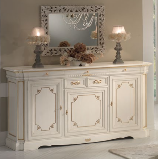 Comò con 3 ante intarsiate e 4 cassetti. È possibile un'opzione con ante lisce. Le finiture possono essere scelte dal campionario di fabbrica.