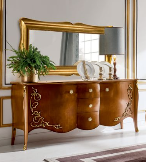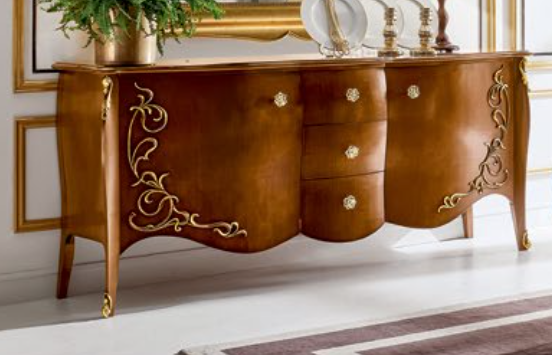Cassettiera in legno con elementi intagliati e in rilievo, con 2 ante e 3 cassetti. Le finiture possono essere scelte dal campionario di fabbrica.