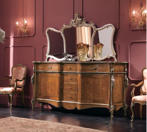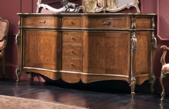 Cassettiera a 2 ante e 6 cassetti con intagli. Le finiture possono essere scelte dal campionario di fabbrica.
