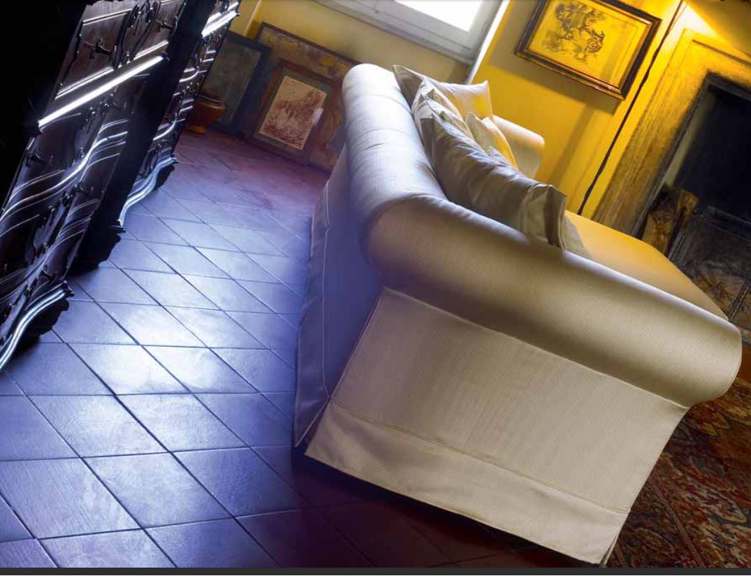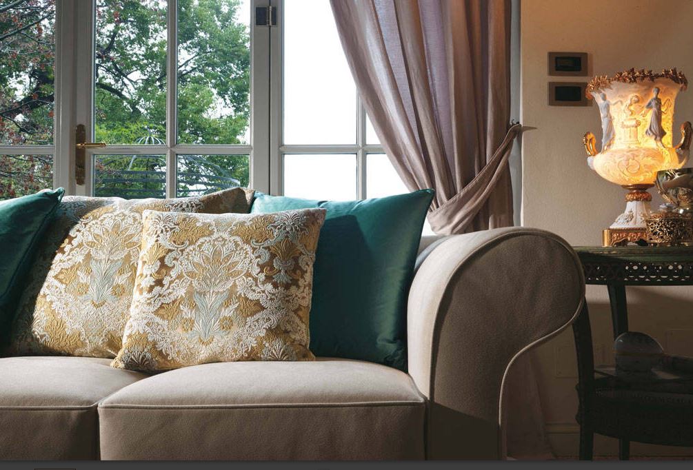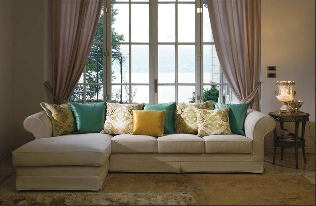 Il divano Capriccio della fabbrica Biba ha un corpo solido e contorni classici, grazie ai morbidi supporti dei braccioli, ai rigogliosi cuscini, alla gonna lunga fino al pavimento e all'abbondanza di cuscini. Il modello borghese può essere posizionato linearmente o avere un design ad angolo con una sezione divano dotata di un grande box o dello stesso modulo.