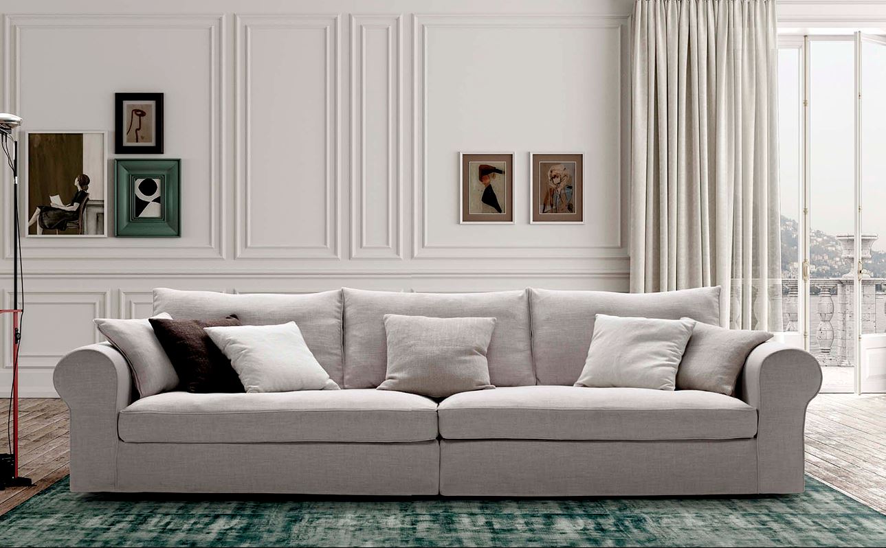 Divano RALPH BIBA salott con rivestimento morbido. Struttura in legno e multistrato, imbottita in poliuretano a densità differenziate e ricoperta con resina legante spessore 10 mm. Il molleggio del sedile è realizzato con nastri elastici intrecciati ad alta densità. I cuscini di seduta sono realizzati in piuma naturale 100% depolverata, lavata e sterilizzata, a camere divise orizzontalmente e supportate da un inserto in poliuretano. I cuscini dello schienale sono in piuma naturale depolverata lavata e sterilizzata al 50%, a camere divise orizzontalmente e in poliuretano al 50%; completamente rivestito con tela di cotone 100%.