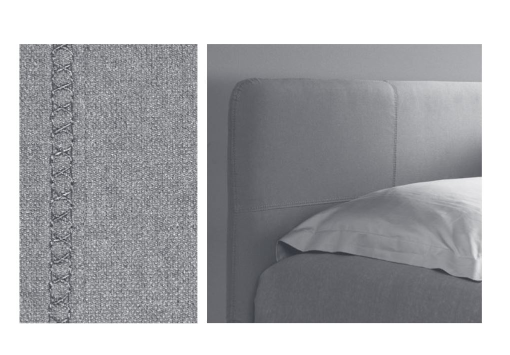 Letto TEO Biba Salotti con morbida imbottitura, morbida testiera decorata con cuciture, giroletto di alta qualità in multistrato di pioppo. Ampia scelta di misure e rivestimenti. È possibile la soluzione letto con contenitore.