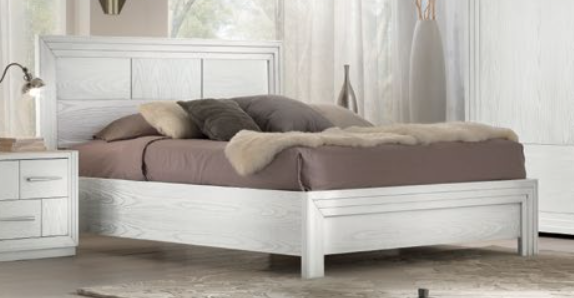 Letto matrimoniale in frassino con testiera in legno e contenitore interno.