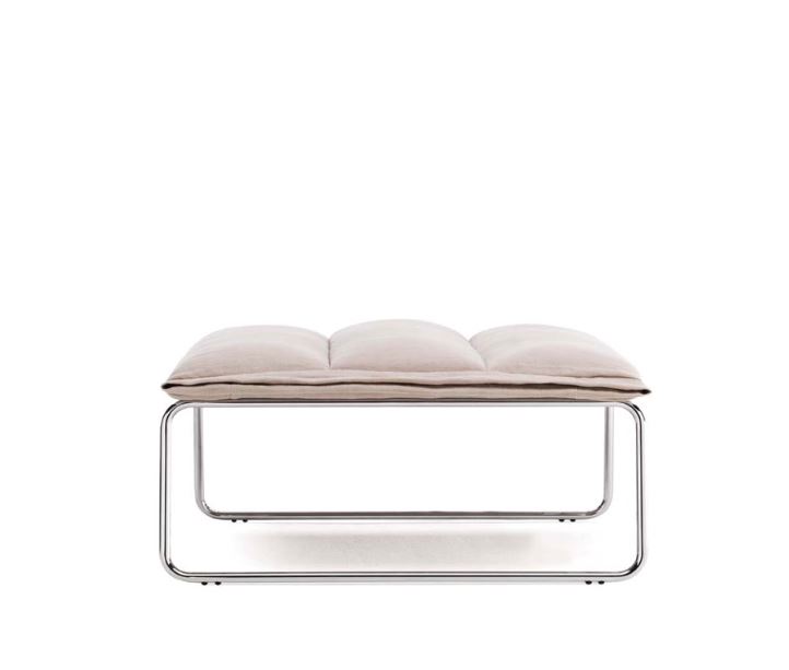 Pouf Frog della manifattura BIBA salotti, realizzato su struttura in acciaio sostenuta da ampie guide. Struttura in legno e multistrato, imbottita in poliuretano a densità differenziate e rivestita con resina adesiva spessore 10 mm. Il molleggio del sedile è realizzato con nastri elastici intrecciati ad alta densità. Inserti sedile in poliuretano con densità minima 30 HR, rivestiti con uno strato di Dacron. Costruzione in metallo cromato lucido.