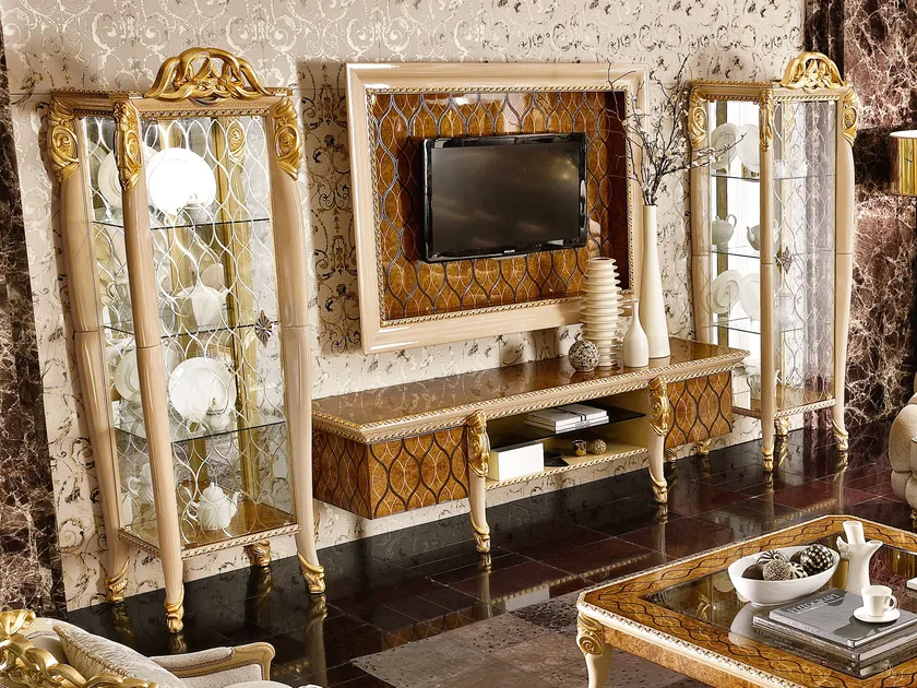 Il design del Mobile TV HARMONY è caratterizzato da linee raffinate e dettagli squisiti. Gli intagli decorativi aggiungono profondità e texture, mentre la mensola in vetro liscia fornisce un contrasto moderno. L'aspetto complessivo è curato per evocare un senso di lusso e sofisticatezza, rendendolo un pezzo d'impatto in qualsiasi stanza.