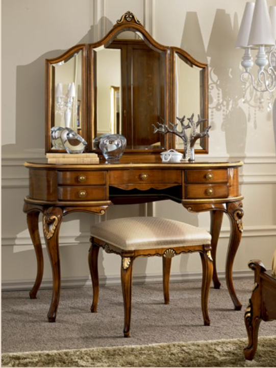 Toilette figurata con intagli, 5 cassetti e intarsio. Inoltre è possibile ordinare un alzatina con specchio 604/A-VH (101x8x93). Le finiture possono essere scelte dal campionario di fabbrica.