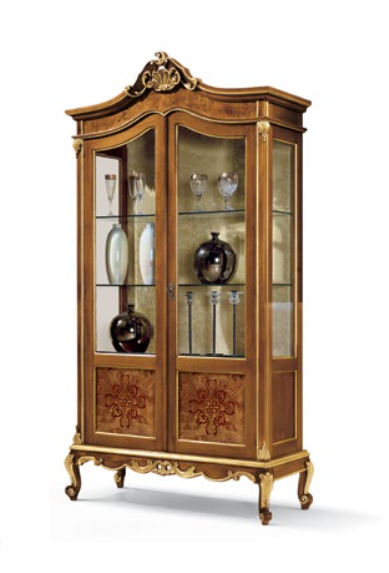 Vetrina con intarsio, elementi intagliati e 2 ante. Le finiture possono essere selezionate dal campionario di fabbrica.
