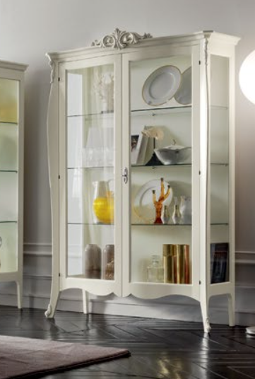 Vetrina con elementi intagliati, 2 ante e ripiani in vetro. Le finiture possono essere scelte dal campionario di fabbrica.