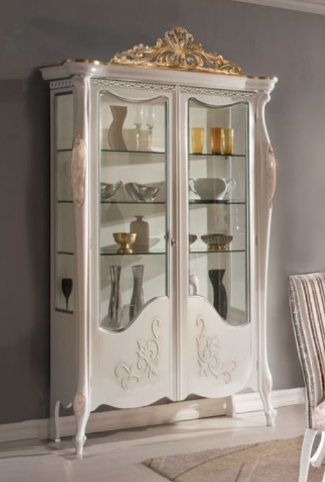 Vetrina con 2 ante intagliate, parete di fondo in legno. Le finiture possono essere scelte dal campionario di fabbrica.