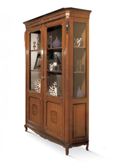 Vetrina con elementi intagliati, con 2 ante intarsiate, ripiani e schienale in legno, con gambe intagliate. La finitura dell'anta è disponibile in varie opzioni: liscia, intarsiata o intagliata.