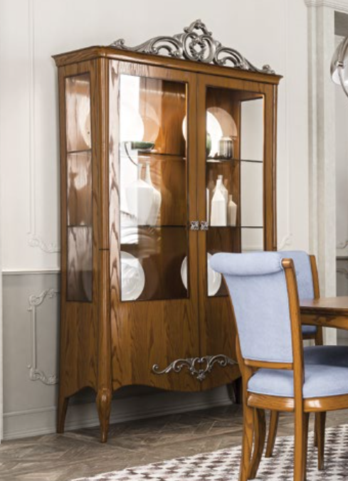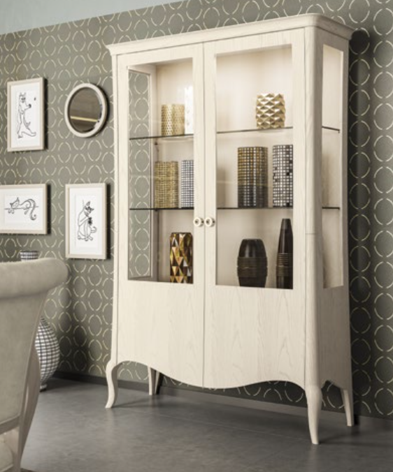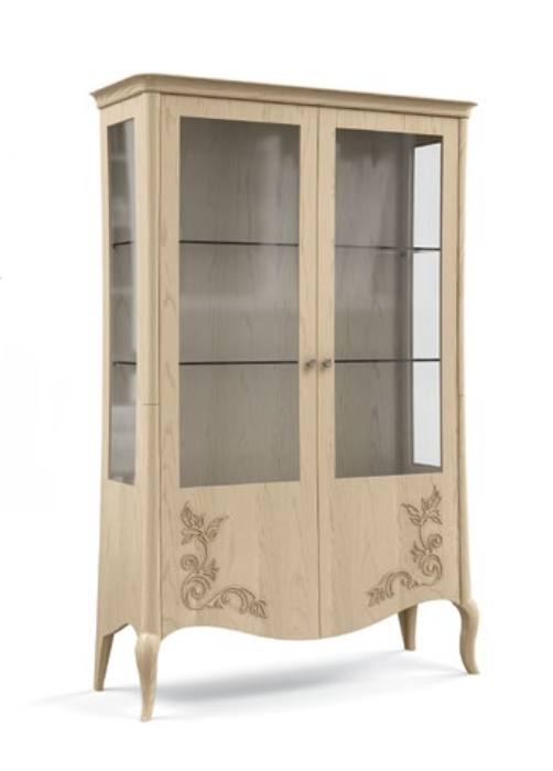 Vetrina con 2 ante lisce e schienale in legno. Le ante sono disponibili con finiture traforate o intagliate.