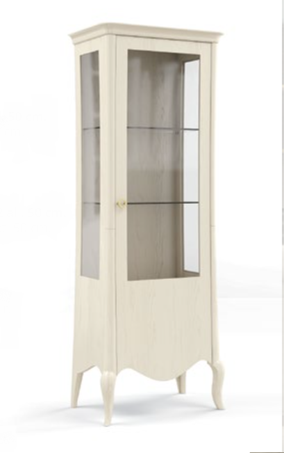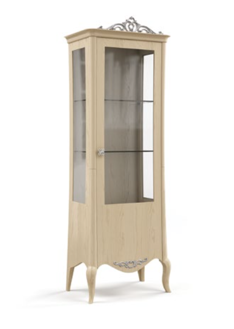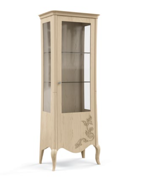 Vetrina realizzata in frassino, 1 anta liscia destra o sinistra, con schienale in legno. È possibile una vetrina con forature sulle ante o intagli. Le finiture possono essere scelte dal campionario di fabbrica.