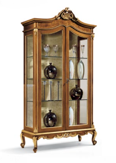 Vetrina tutta vetro con elementi intagliati e 2 ante. Le finiture possono essere selezionate dal campionario di fabbrica.